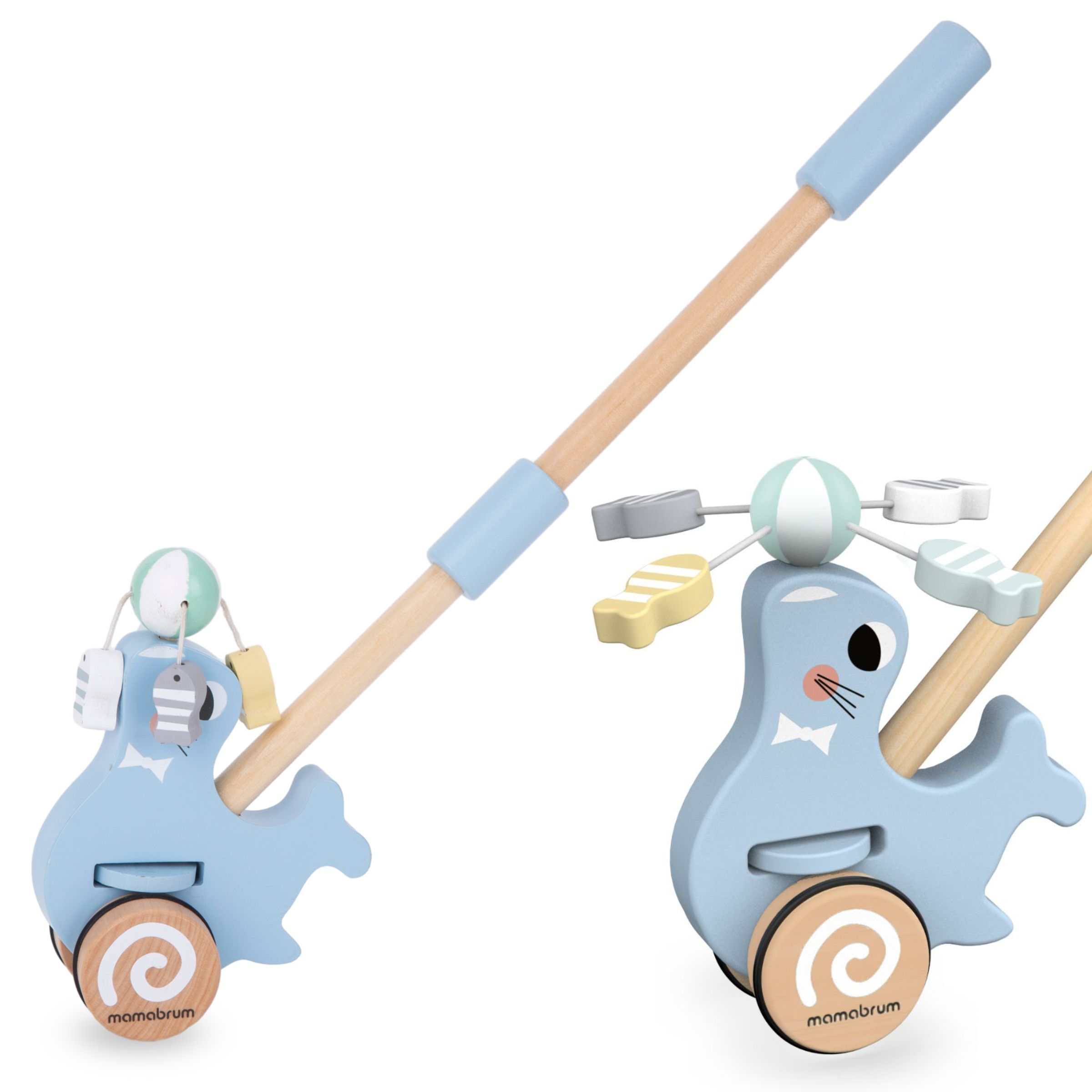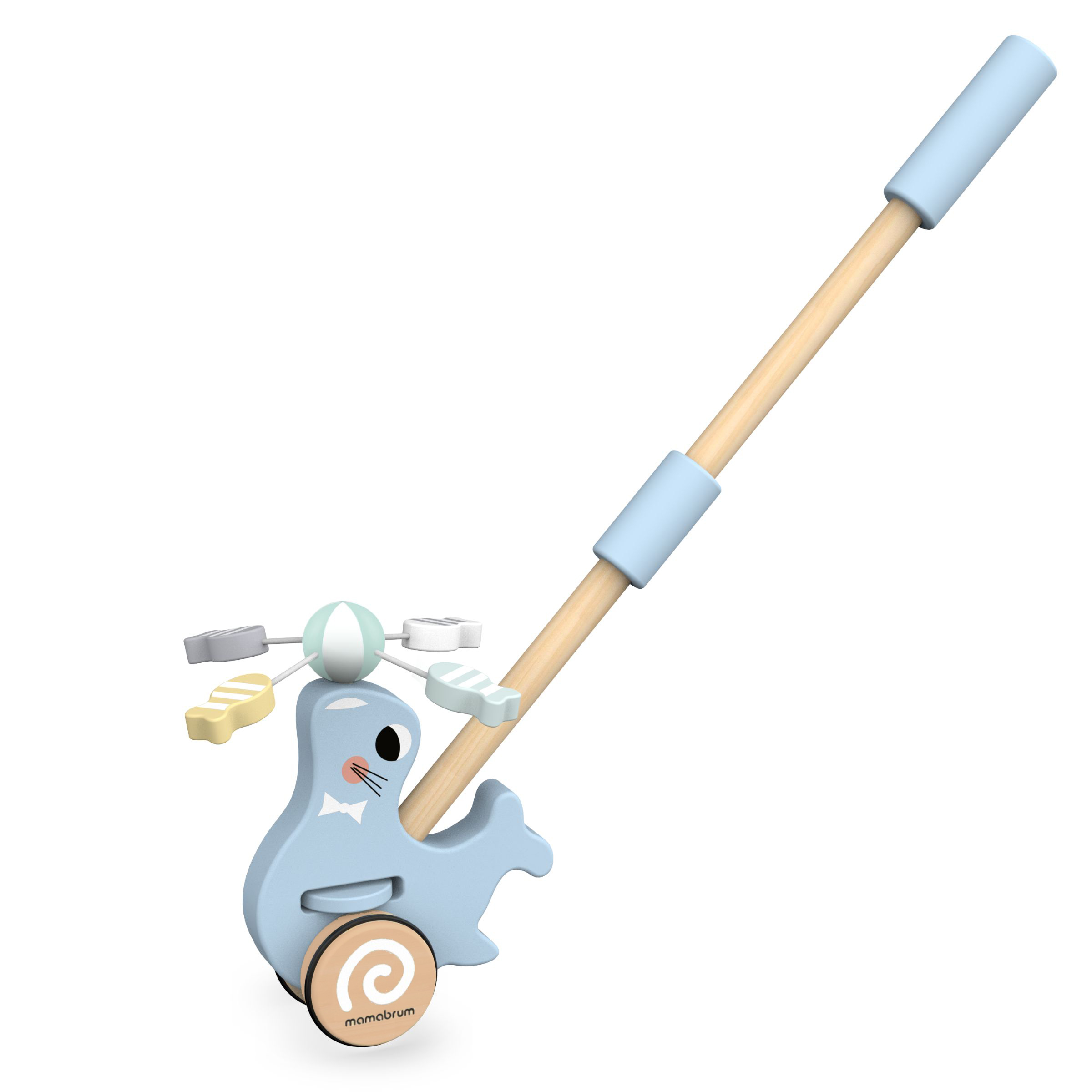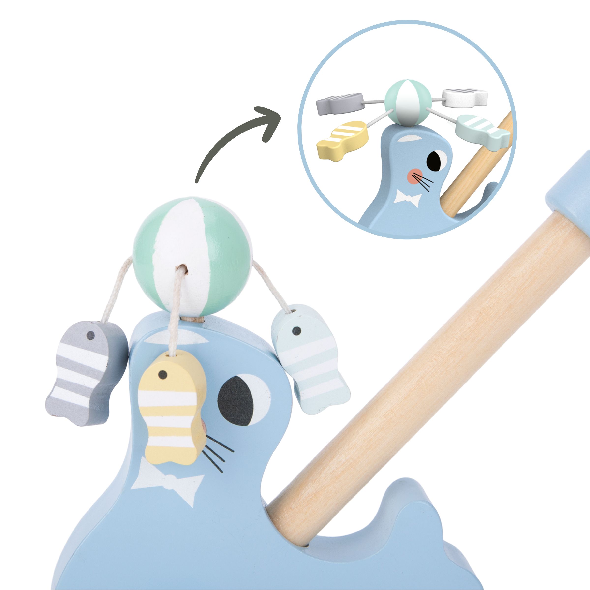Žavus ruoniukas padės jūsų mažyliui jaustis labiau pasitikinčiam savimi, kai jis tobulins vaikščiojimo įgūdžius. Tiesiog paimkite prie jo pritvirtintą strypelį, kad taptų mielu palydovu pasivaikščiojimams ne tik po namus, bet ir lauke. Stumdamas ruoniuką mažylis gali stebėti, kaip juda ant jo snukučio esantis kamuoliukas. Jos dėka pirmieji pasivaikščiojimai virs tikru malonumu!