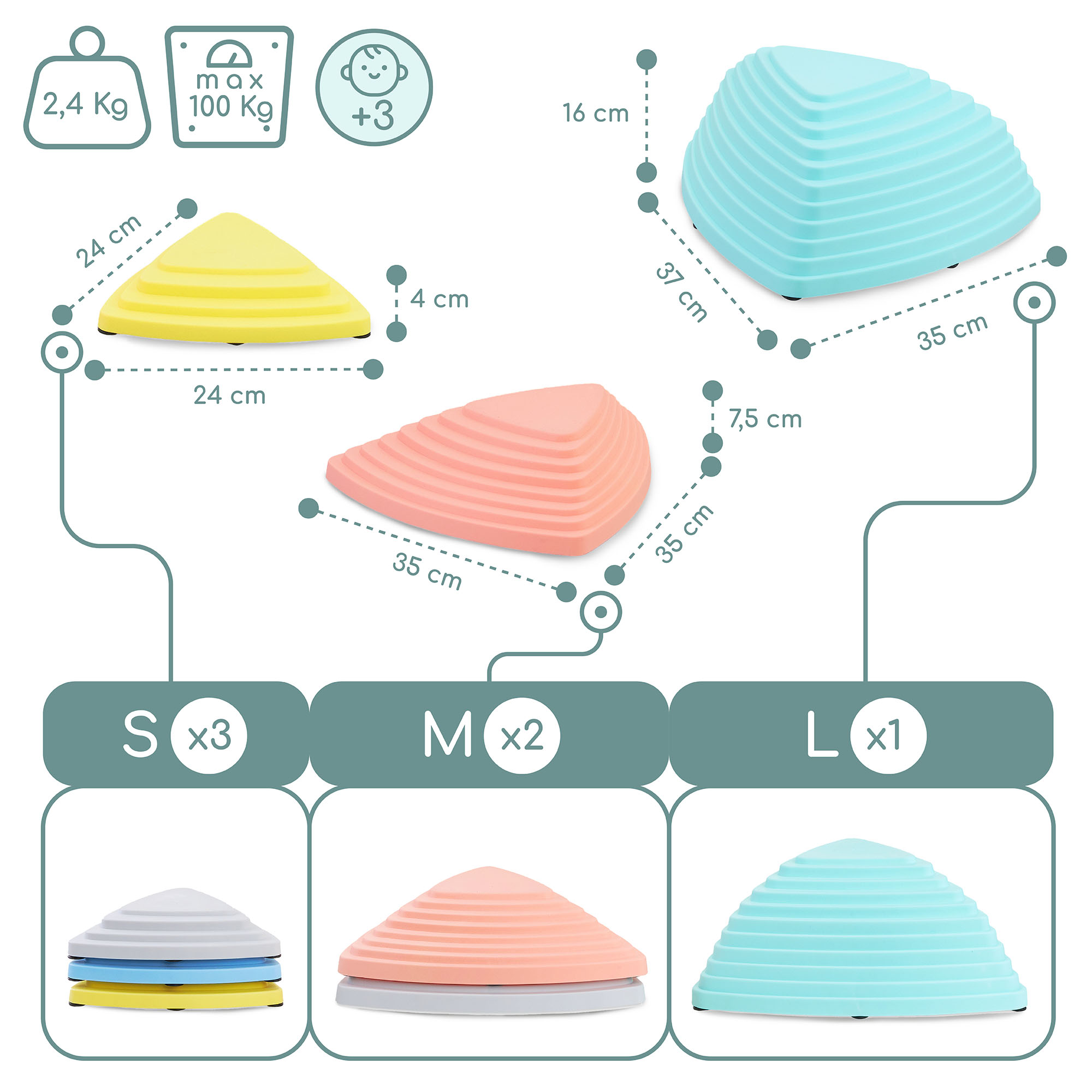 Balansavimo akmenų rinkinį sudaro 6 skirtingų dydžių ir spalvų akmenys. Paprasčiausiai išdėliokite juos tam tikru atstumu vienas nuo kito, kad jūsų mažylis turėtų patrauklią pramogą. Balansavimas ant kelių akmenų yra puiki pusiausvyros treniruotė ir lavina judesių koordinaciją. Rinkinys yra puikus pasirinkimas ne tik namams, bet ir vaikų darželiui ar reabilitacijos kambariui.