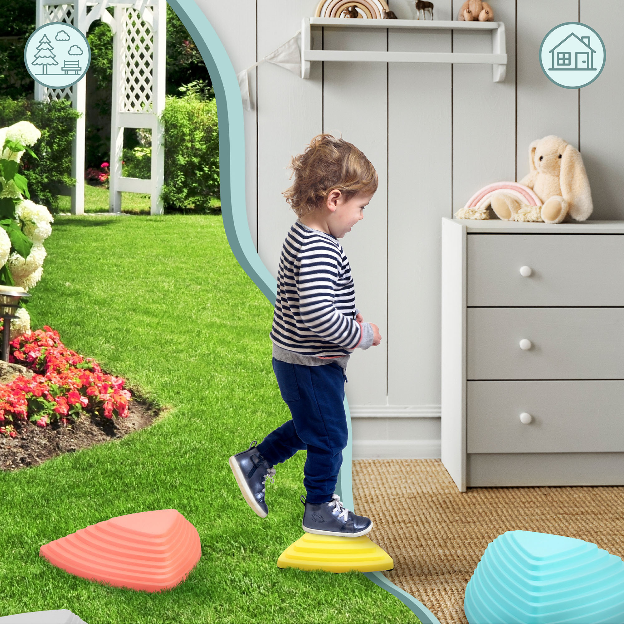 Neslidus sensorinių akmenų paviršius apsaugo vaikus nuo skausmingų kritimų ir suteikia pėdoms puikų sukibimą. Dėl patvaraus, bet lengvo plastiko rinkinys puikiai tinka mažųjų žaidimams ir pusiausvyros pratimams, saugiai palaiko jų motorikos vystymąsi.