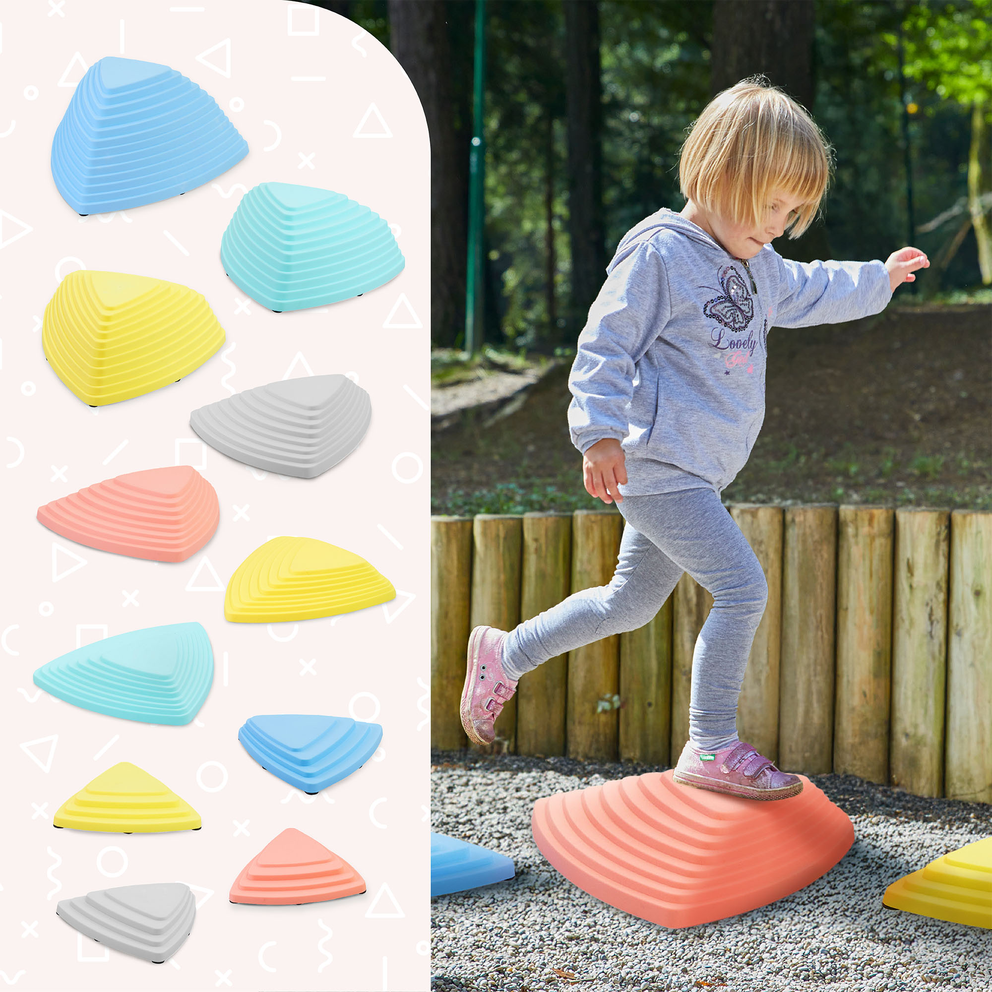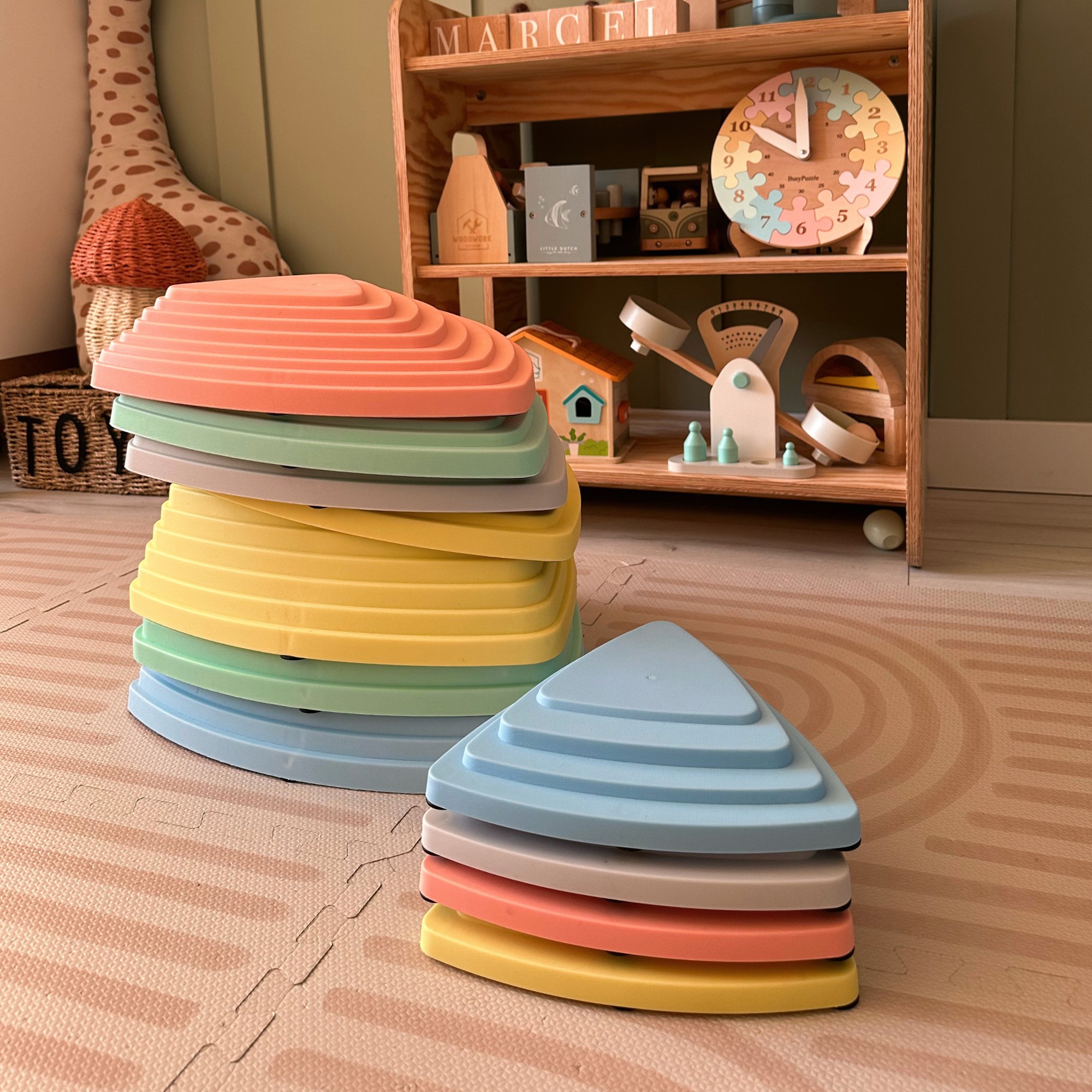 Balansavimo akmenų rinkinį sudaro 11 skirtingų dydžių ir spalvų akmenų. Paprasčiausiai išdėliokite juos tam tikru atstumu vienas nuo kito, kad jūsų mažylis turėtų patrauklią pramogą. Balansavimas ant kelių akmenų yra puiki pusiausvyros treniruotė ir lavina judesių koordinaciją. Rinkinys yra puikus pasirinkimas ne tik namams, bet ir vaikų darželiui ar reabilitacijos kambariui.