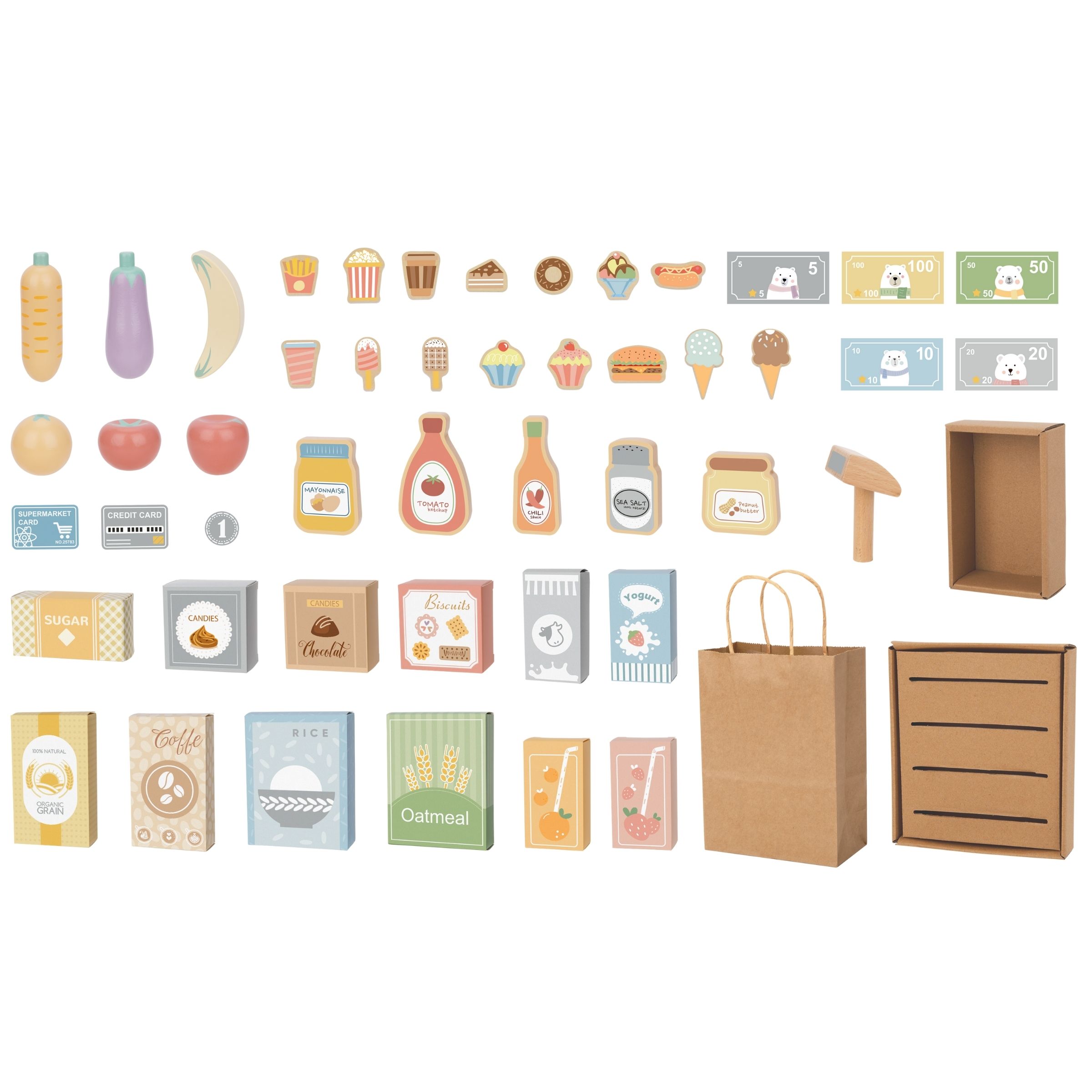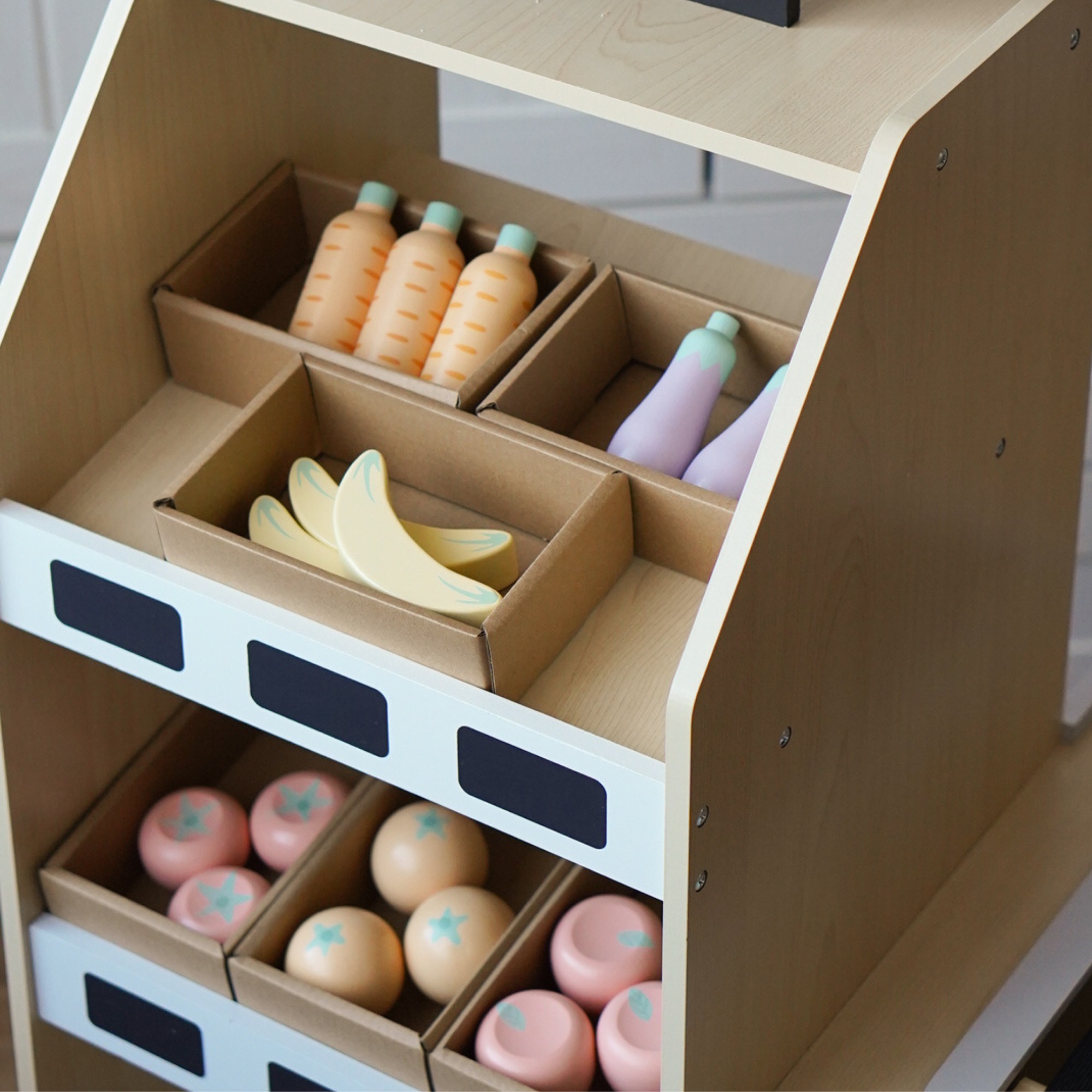 Daugybė lentynų prekėms išdėstyti leidžia mažajam parduotuvės savininkui rūšiuoti produktus ir patogiai juos išdėstyti. Dėl tvirto stendo ir gausios medinio prekystalio įrangos jūsų vaikas gali imtis pardavėjo ar pirkėjo vaidmens ir pasirūpinti nepakartojama, kūrybinga pramoga.