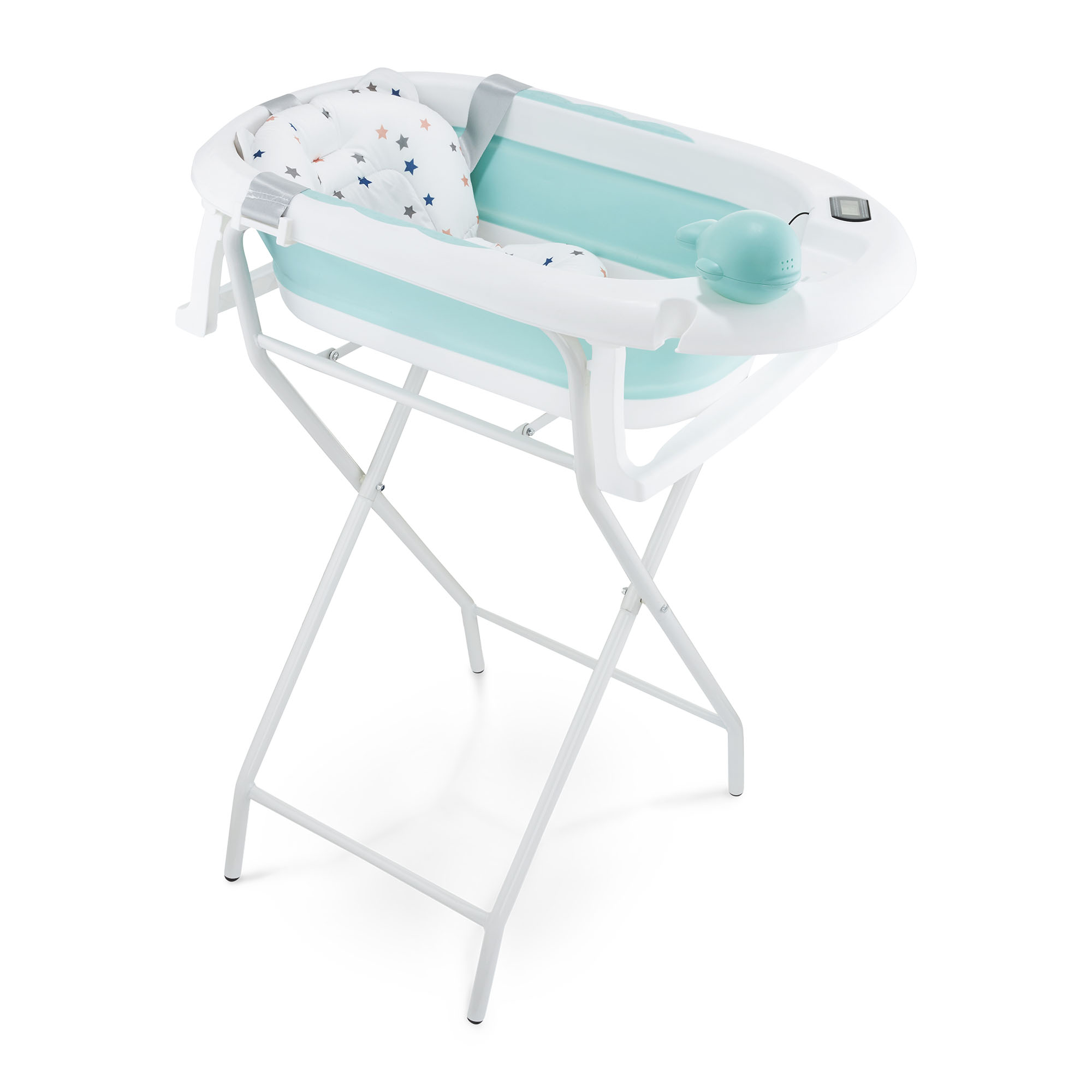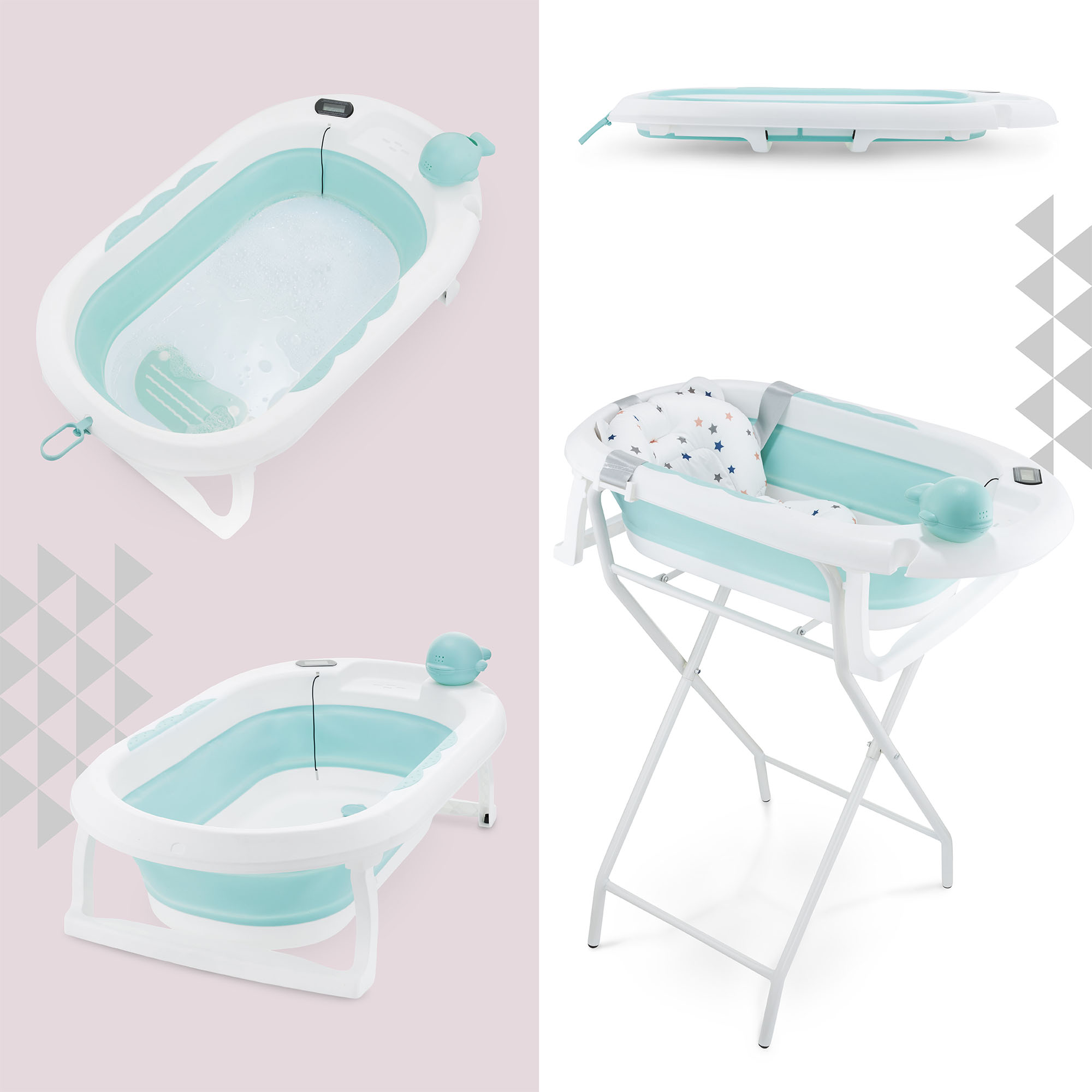 Sulankstoma kūdikių vonelė su termometru, įdėklu ir stovu - mėtų spalvos