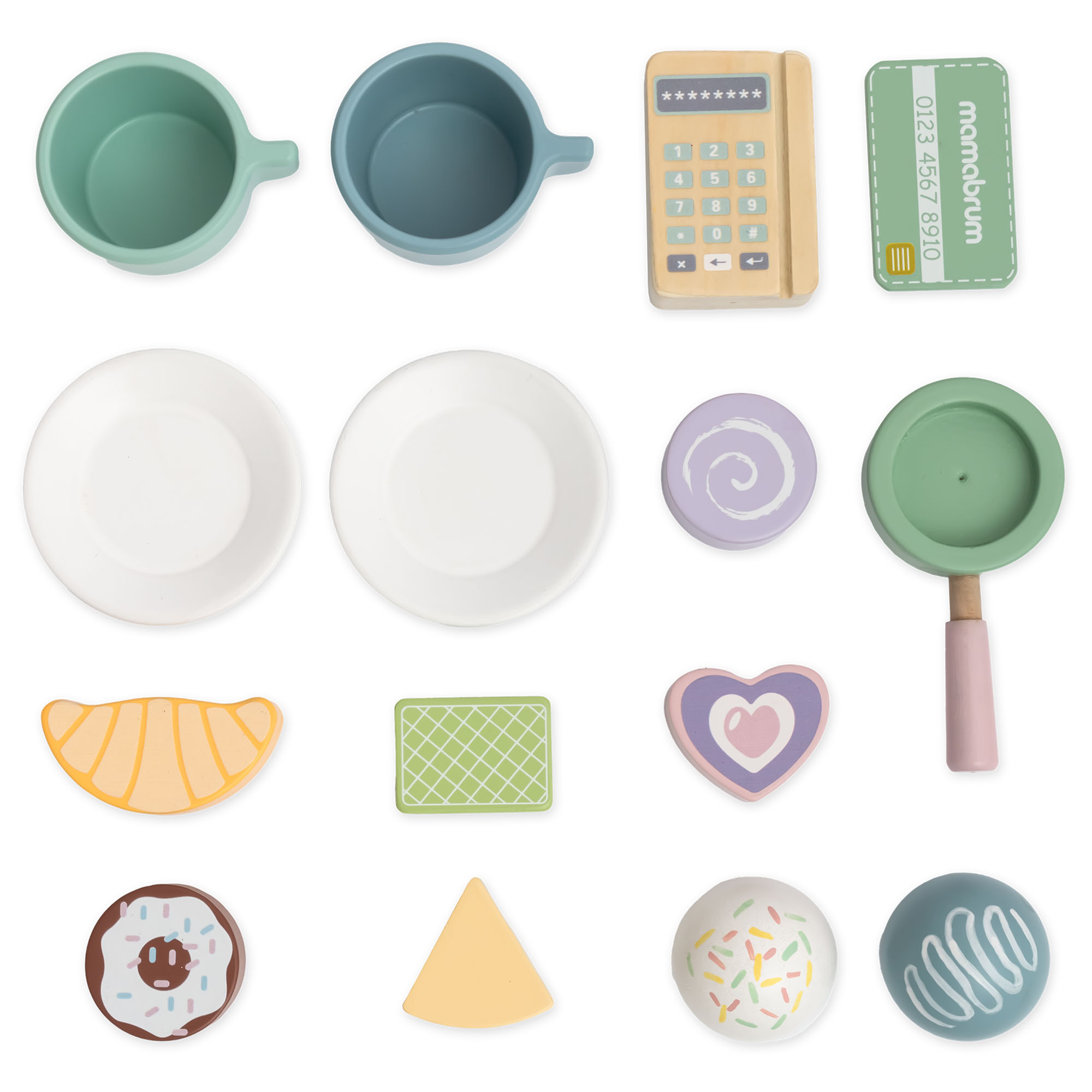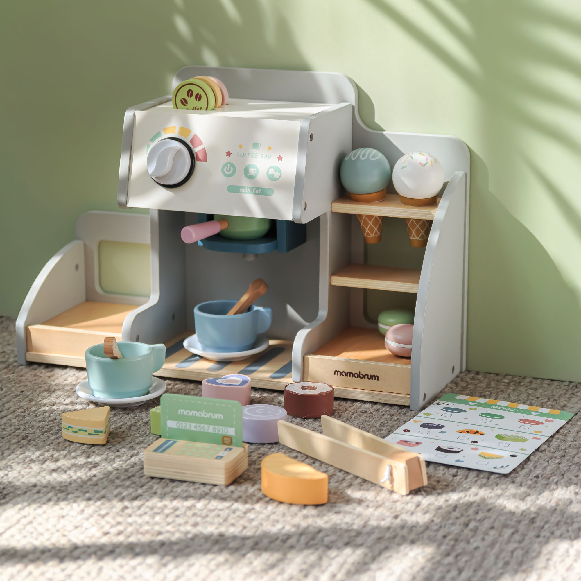 Su daugybe priedų įrengta kavinė yra kūrybinių pramogų receptas. Rinkinys skatina vaikų vaizduotę, o dėl švelnių spalvų ir modernaus dizaino puikiai dera prie vaiko kambario interjero. Iš natūralaus medžio pagamintas žaislas padeda ugdyti mažylių socialinius, motorinius ir pažintinius įgūdžius. Dėl įvairių elementų ir tikroviškų funkcijų, pavyzdžiui, spragsinčio kavos aparato ciferblato, žaidimas kaskart gali atrodyti vis kitaip.