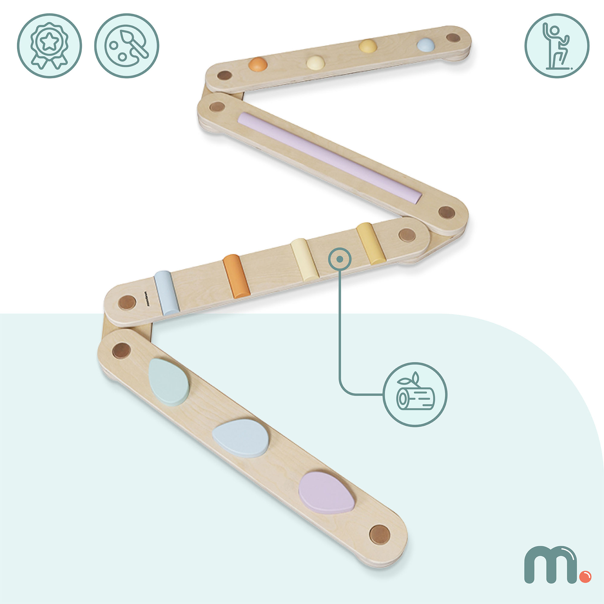 Medinis sensorinis takelis - tai unikalus žaislas, kuris bet kokį interjerą pavers judesio, linksmybių ir mokymosi kupina erdve. Dėl galimybės jį išdėstyti įvairiomis formomis - kvadrato, zigzago ar atviro tako - vaikas įgyja begalę būdų žaisti, kartu lavindamas pusiausvyrą, koordinaciją ir vaizduotę. Įdomių formų spalvingi sensoriniai elementai dar labiau stimuliuoja pojūčius ir skatina aktyvų žaidimą.