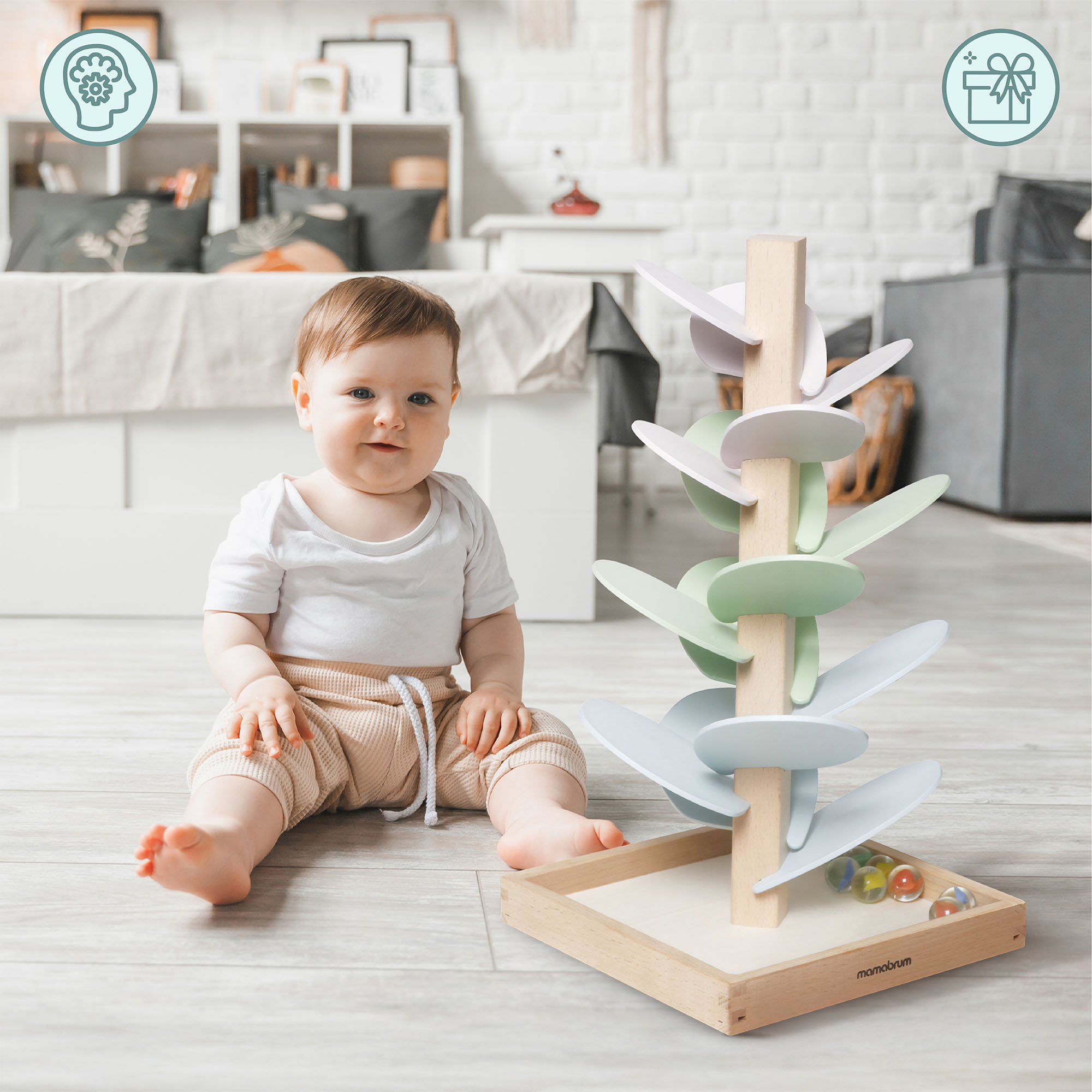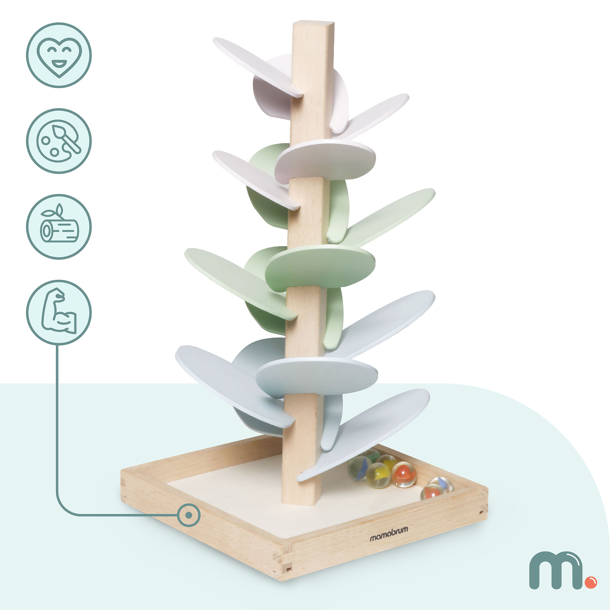 Medinis medis taps unikalia vaiko kambario puošmena, suteikiančia kambariui ramybės ir magijos prieskonį. Pastelinių spalvų lapai džiugina savo švelnumu, o permatomi rutuliukai su spalvotu viduriu suteikia visumai nepakartojamą vizualinį efektą. Žaislas moko kantrybės, susikaupimo ir koordinacijos, kartu turi raminamąjį poveikį, skatinantį vaiko ramybę. Tai ideali dovana, kurioje vystymasis derinamas su kūrybišku ir smagiu žaidimu.