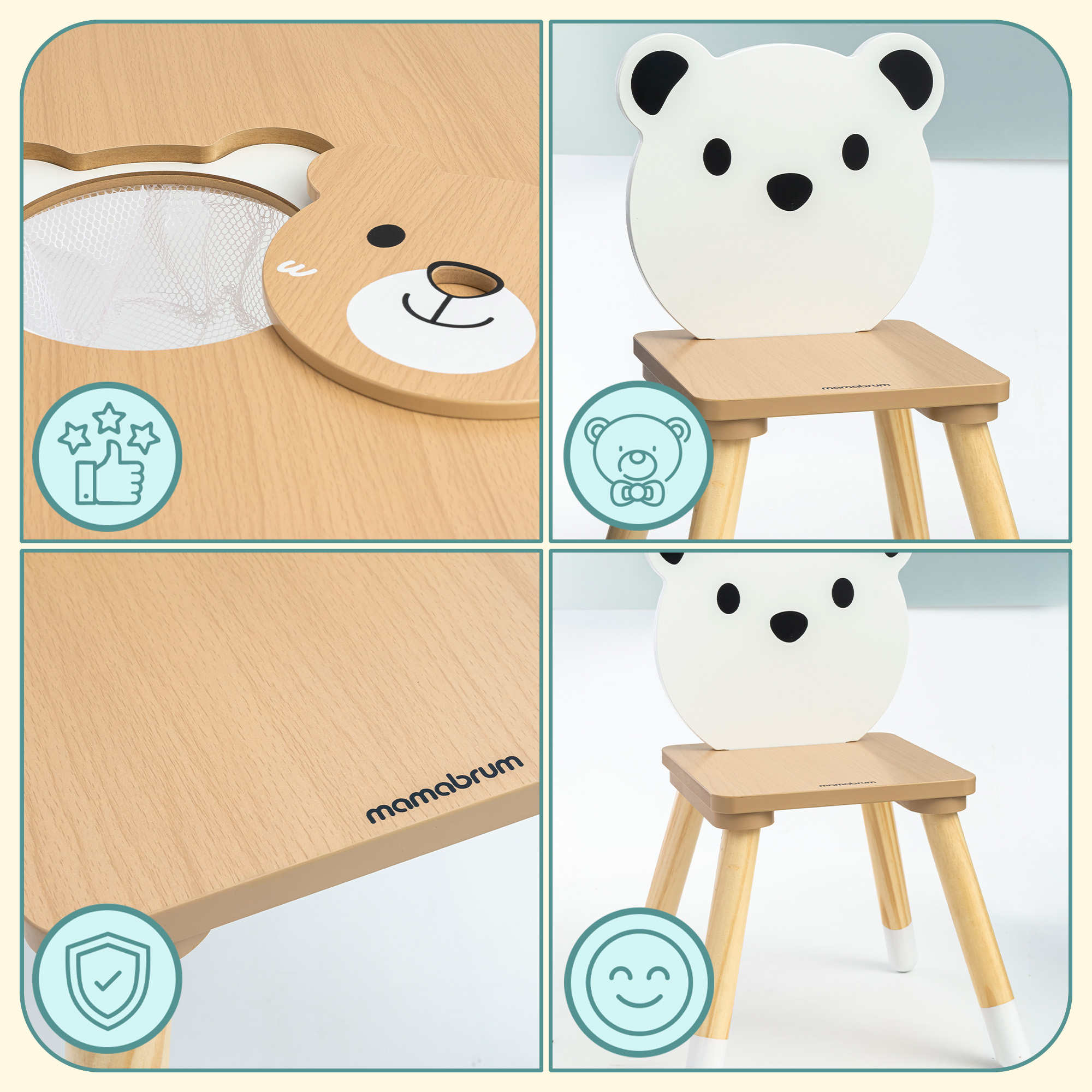 Šis komplektas ne tik vizualiai patrauklus, bet ir lavina vaikų savarankiškumą. Stalas su daiktadėže padeda palaikyti tvarką , o kėdės su meškiukų atlošais skatina leisti laiką prie stalo kartu. Dėl tinkamo sėdynės aukščio (26,5 cm) baldai yra patogūs ir saugūs mažiesiems vartotojams.