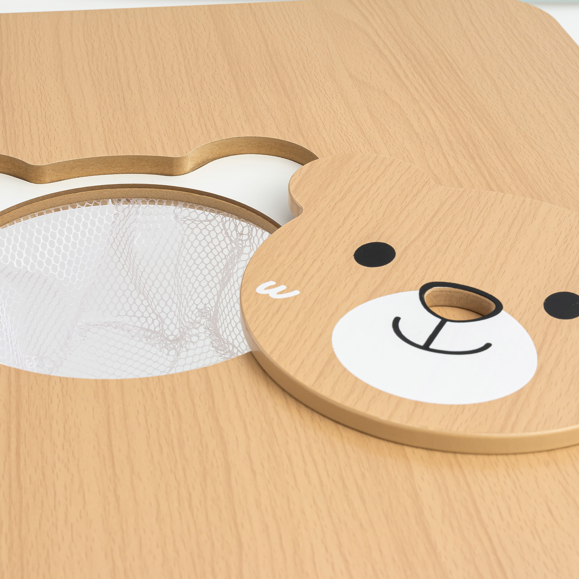Centrinis daiktadėžės skyrius, pagamintas iš lanksčios tinklelio, yra tikras šio stalo akcentas – sumaniai paslėptas po stalviršiu , jis leidžia greitai susidėti pieštukus, kaladėles ar mėgstamus žaislus, tuo pačiu išlaikant tvarką ant stalo. Skyrius turi praktišką, meškiuko formos dangtelį , kuris uždarytas sukuria idealiai lygų paviršių . Vaikai gali lengvai pasiekti visus būtiniausius daiktus, net neatsikeldami nuo stalo. Tai ne tik praktiška, bet ir džiugina mažuosius – kiekvieną kartą, kai jie pasiekia „slaptą kišenę“ po stalviršiu, tai paverčia įprastą žaidimą įdomiu nuotykiu!