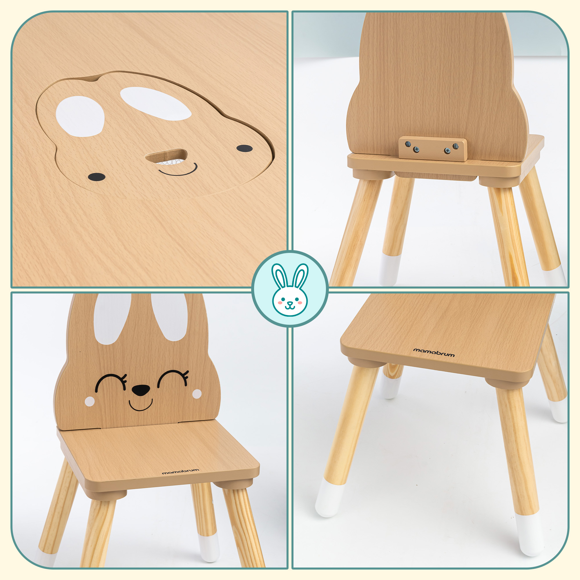 Šis komplektas ne tik vizualiai patrauklus, bet ir lavina vaikų savarankiškumą. Stalas su daiktadėže padeda palaikyti tvarką , o kėdės su zuikio atlošais skatina leisti laiką prie stalo kartu. Dėl tinkamo sėdynės aukščio (26,5 cm) baldai yra patogūs ir saugūs mažiesiems vartotojams.