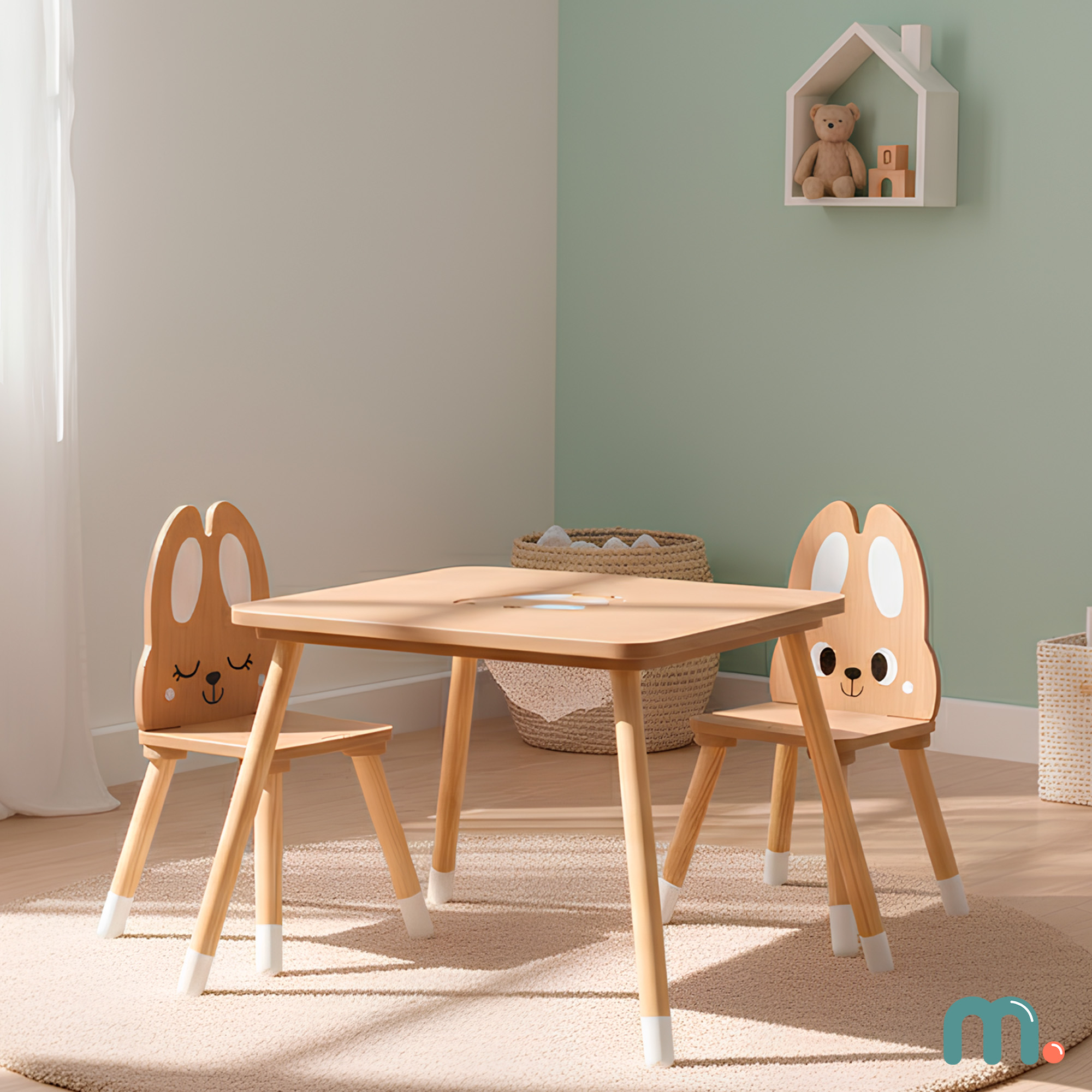 Sukurkite savo vaikui jaukią erdvę, kurioje kiekviena diena gali tapti nauju nuotykiu! Žavingas triušio formos stalo ir kėdžių komplektas sujungia unikalų dizainą, funkcionalumą ir tvirtą meistriškumą . Medinis stalas su centrine saugykla ir dvi triušio formos kėdės sukuria puikią vietą piešti, mokytis, valgyti ar žaisti kartu.