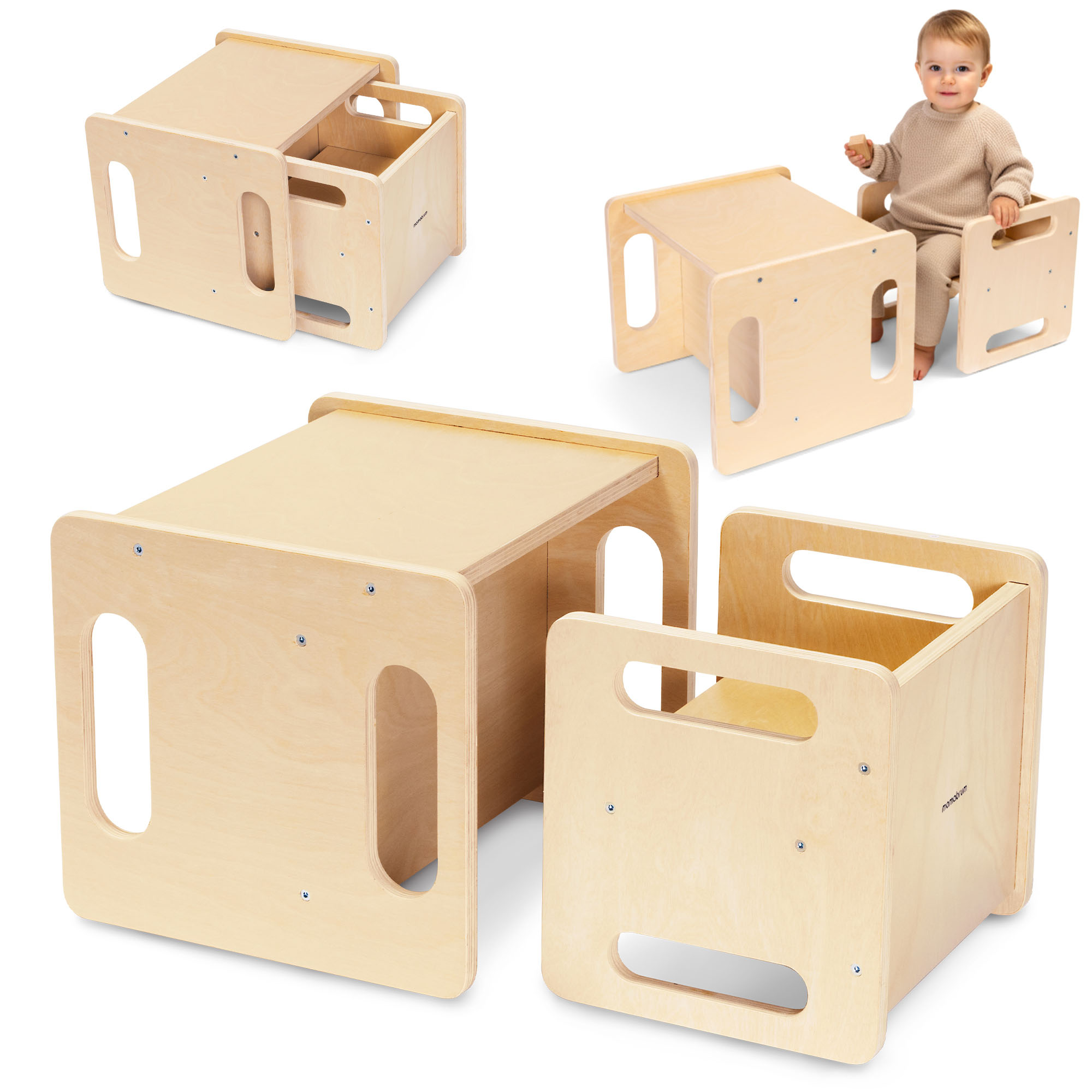 Šis komplektas buvo sukurtas siekiant padėti vaikams atrasti pasaulį ir ugdyti savarankiškumą kasdieniame gyvenime. Paprastas dizainas, natūralios medžiagos ir galimybė savarankiškai naudoti baldus leidžia vaikams laisvai siekti, sėdėti, mokytis ir žaisti, kada tik panorėję. Įvairūs komplekto panaudojimo būdai suteikia vaikams pasirinkimo laisvę ir skatina aktyvumą, puikiai dera su Montessori filosofija , kur praktiškumas ir paprastumas derinami su ugdymu per patirtį.