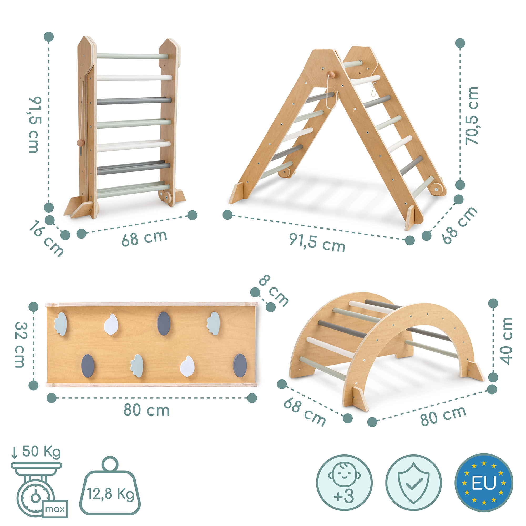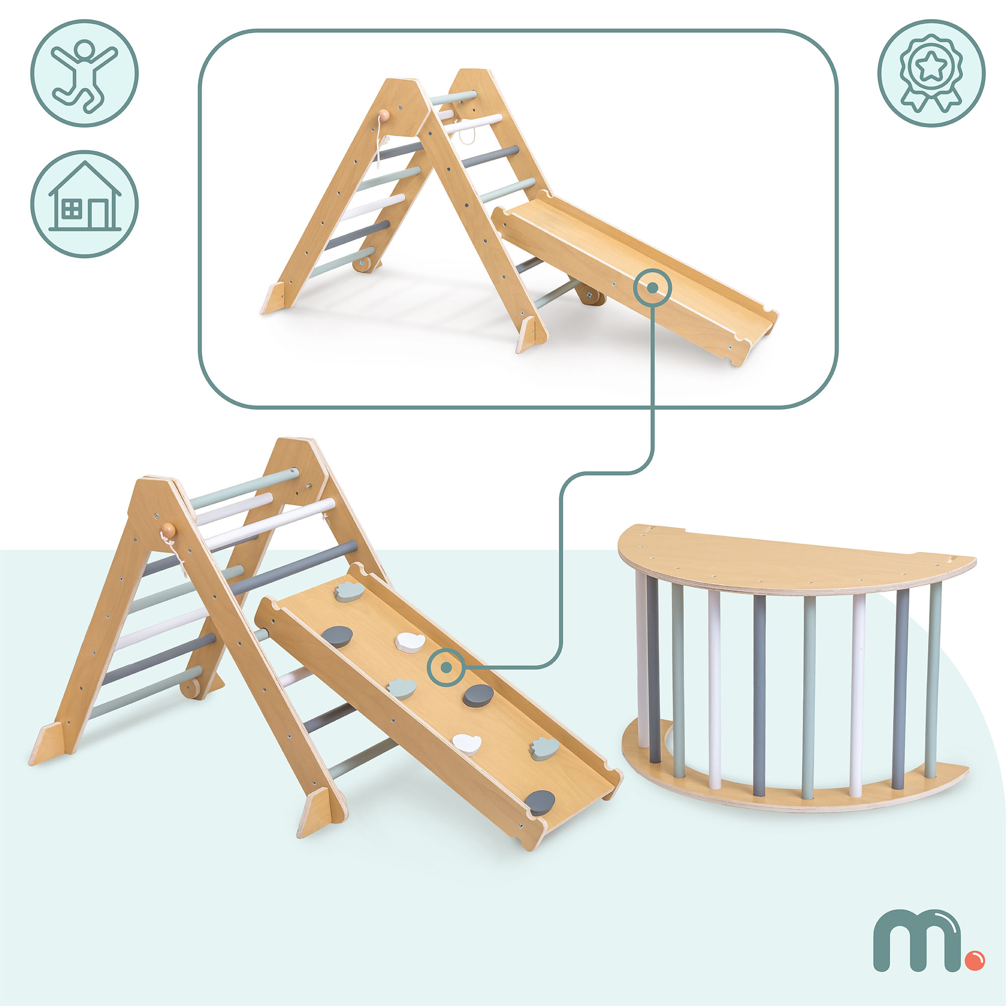 Ši medinė žaidimų aikštelė yra puikus sprendimas tėvams, norintiems kasdien suteikti savo vaikams mankštos ir pramogų neišeinant iš namų . Žaidimų aikštelę sudaro Piklerio trikampis, laipiojimo arka/suptuvėlė ir dvipusė rampa, kurias galima derinti į įvairias konfigūracijas . Tai skatina laipiojimą, balansavimą, slydimą ir kliūčių ruožų įrengimą. Šis rinkinys padeda lavinti vaikų stambiąją motoriką, koordinaciją ir pasitikėjimą savimi.