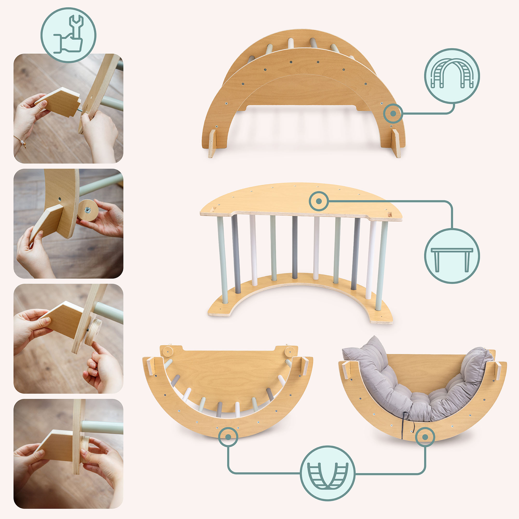 - Laipiojimo arka – skirta laipiojimui ir balansavimui, apversta ant šono gali būti naudojama kaip praktiškas stalas piešimui, skaitymui ar žaidimui.