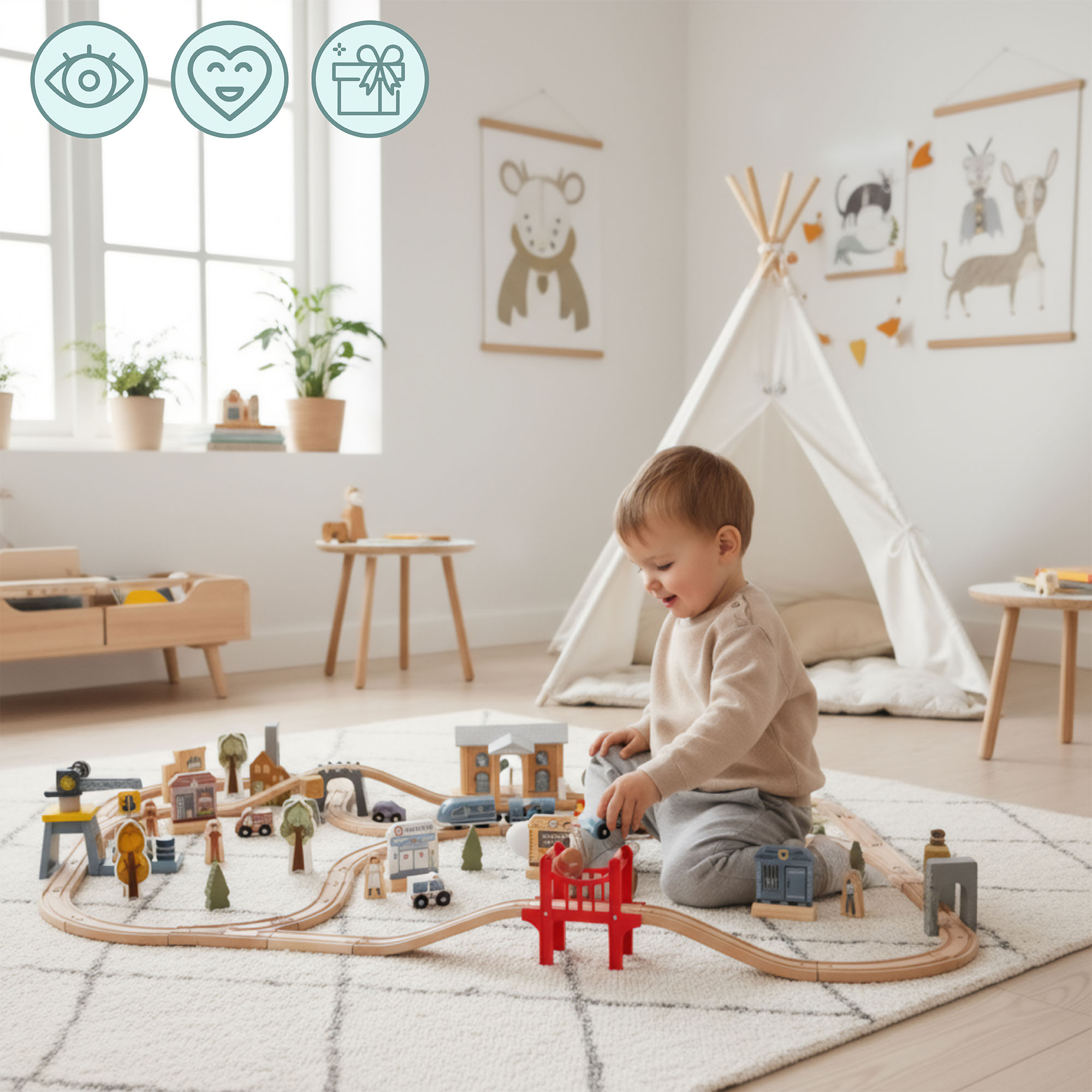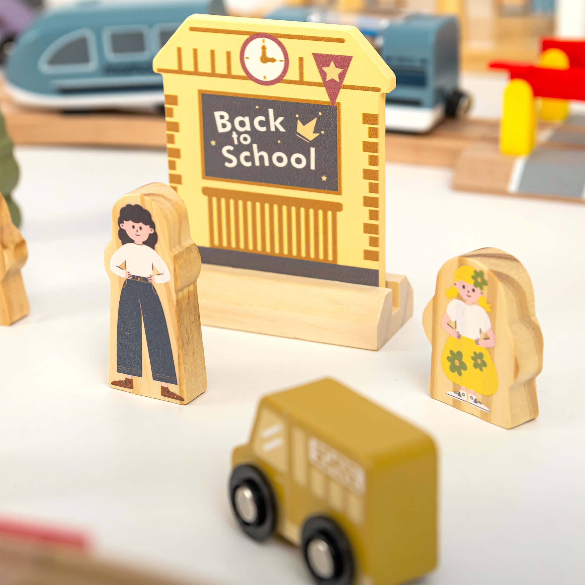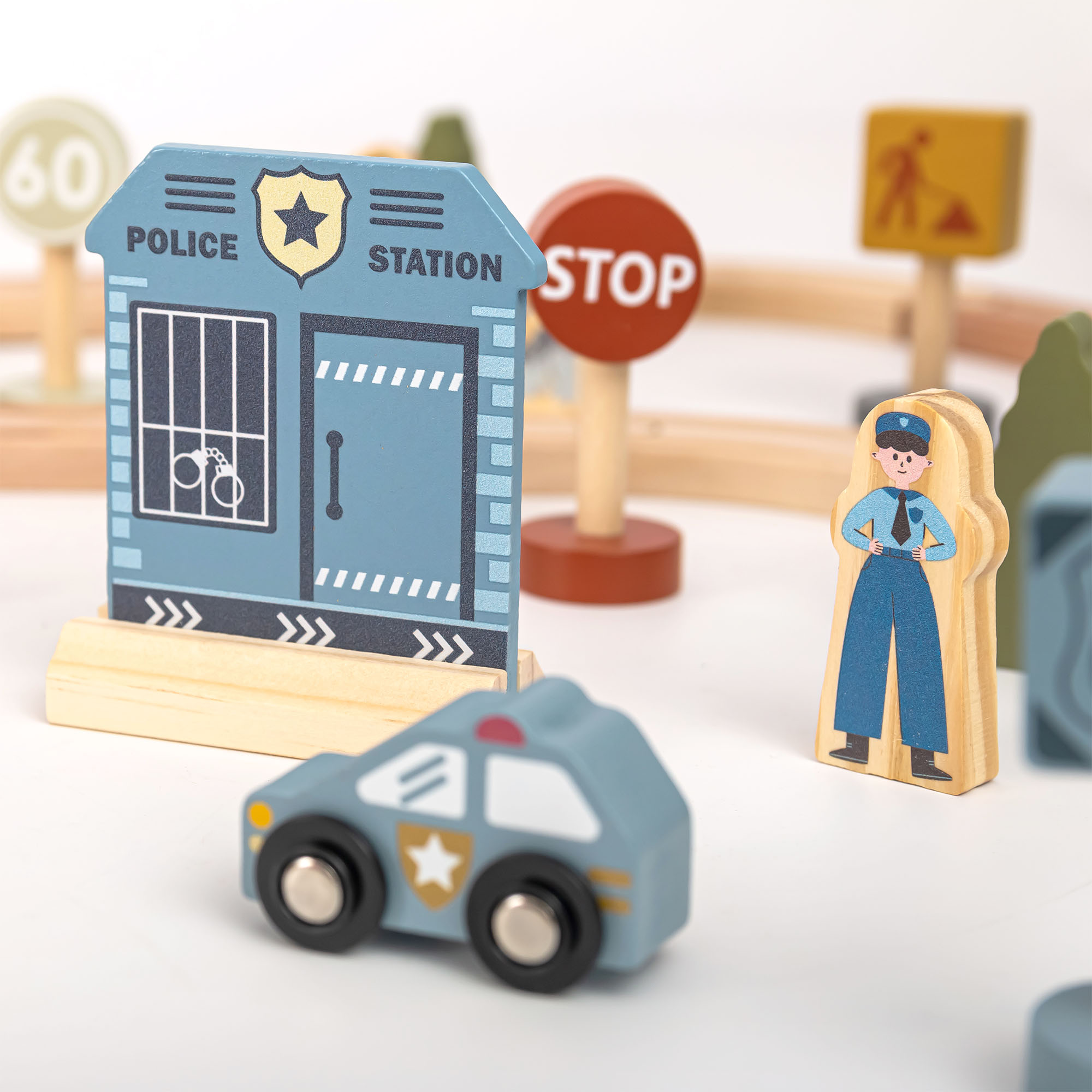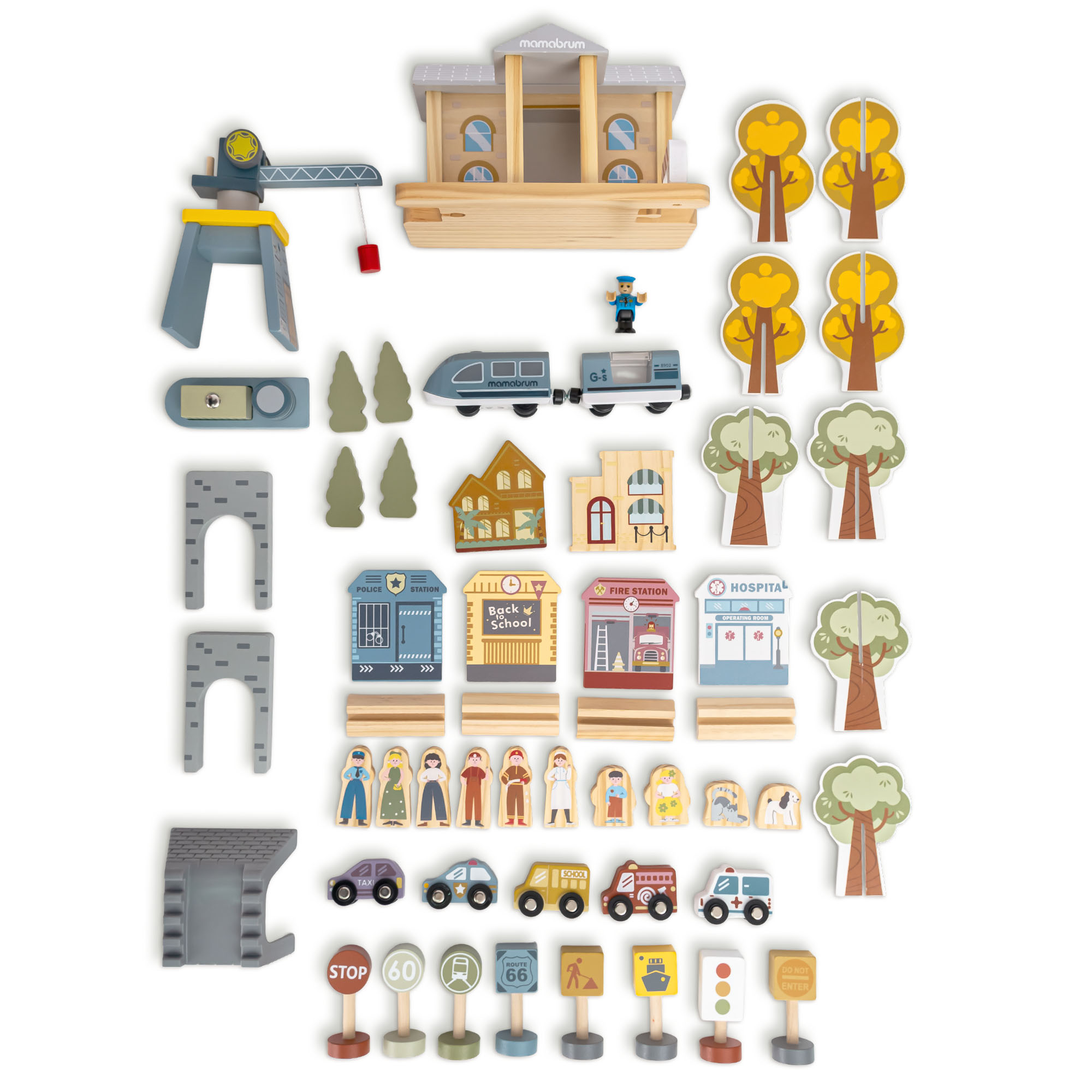 Rinkinyje yra viskas, ko reikia norint sukurti triukšmingą miestą: mokykla, ligoninė, gaisrinė, policijos nuovada , kelio ženklai, medžiai ir gyventojų figūros. Vaikai gali vaidinti kasdienes scenas – gelbėti, mokyti, patruliuoti ir reguliuoti eismą. Žaidimai mieste lavina empatiją, socialinių vaidmenų supratimą ir skatina kūrybiškumą. Kiekvienas vaikas šiandien gali būti traukinio mašinistu, o rytoj – ugniagesiu ar gydytoju.