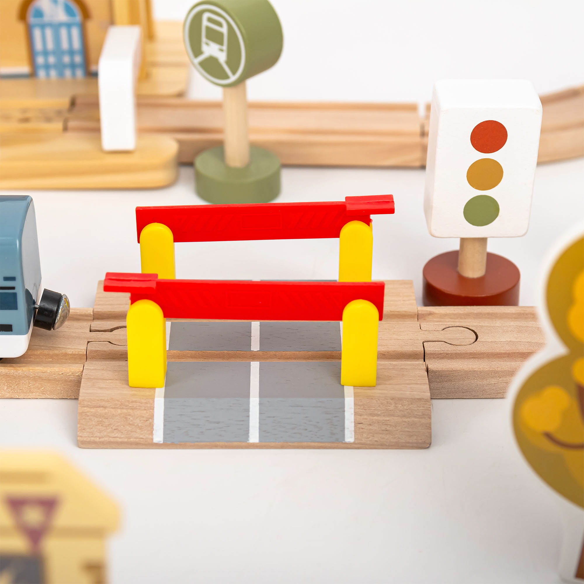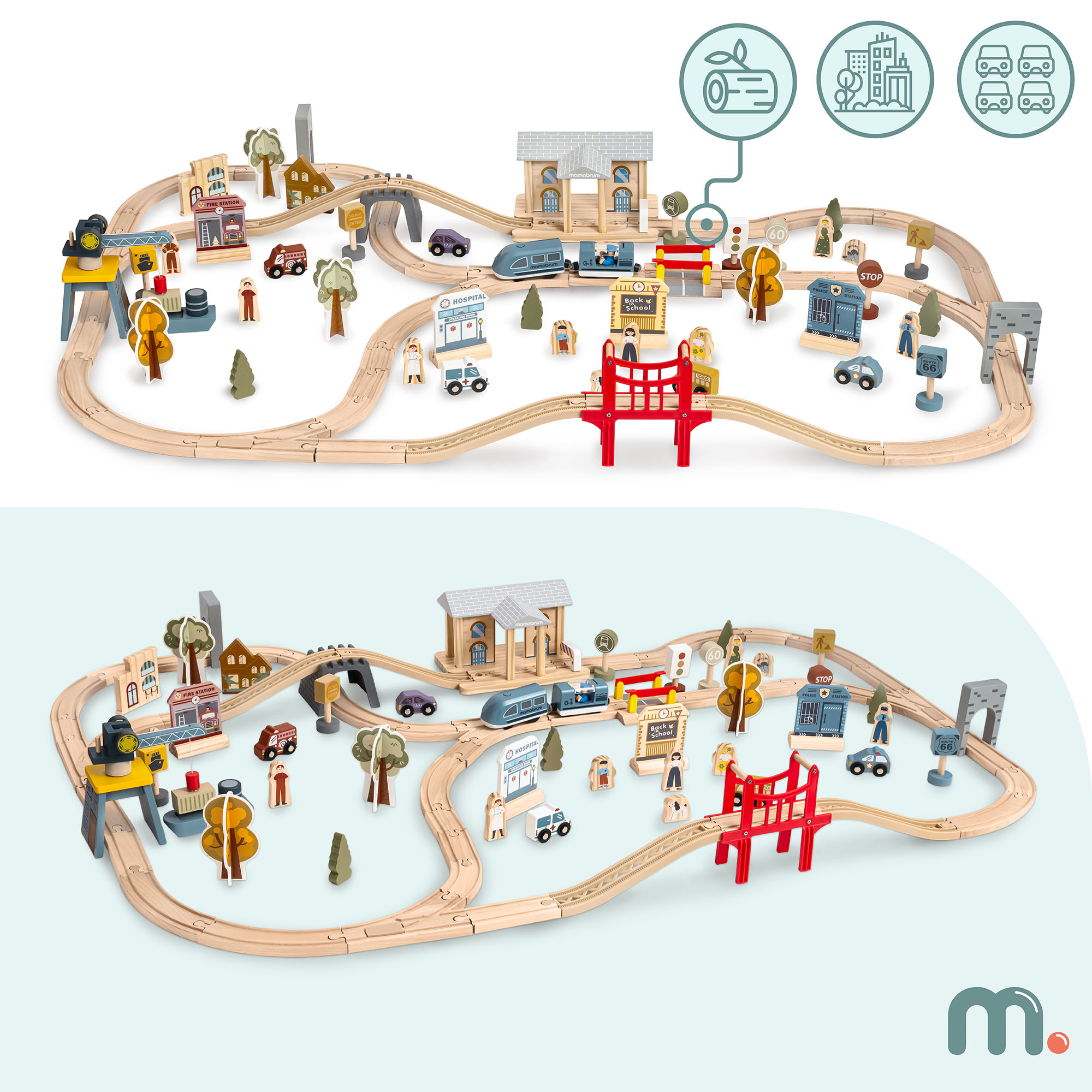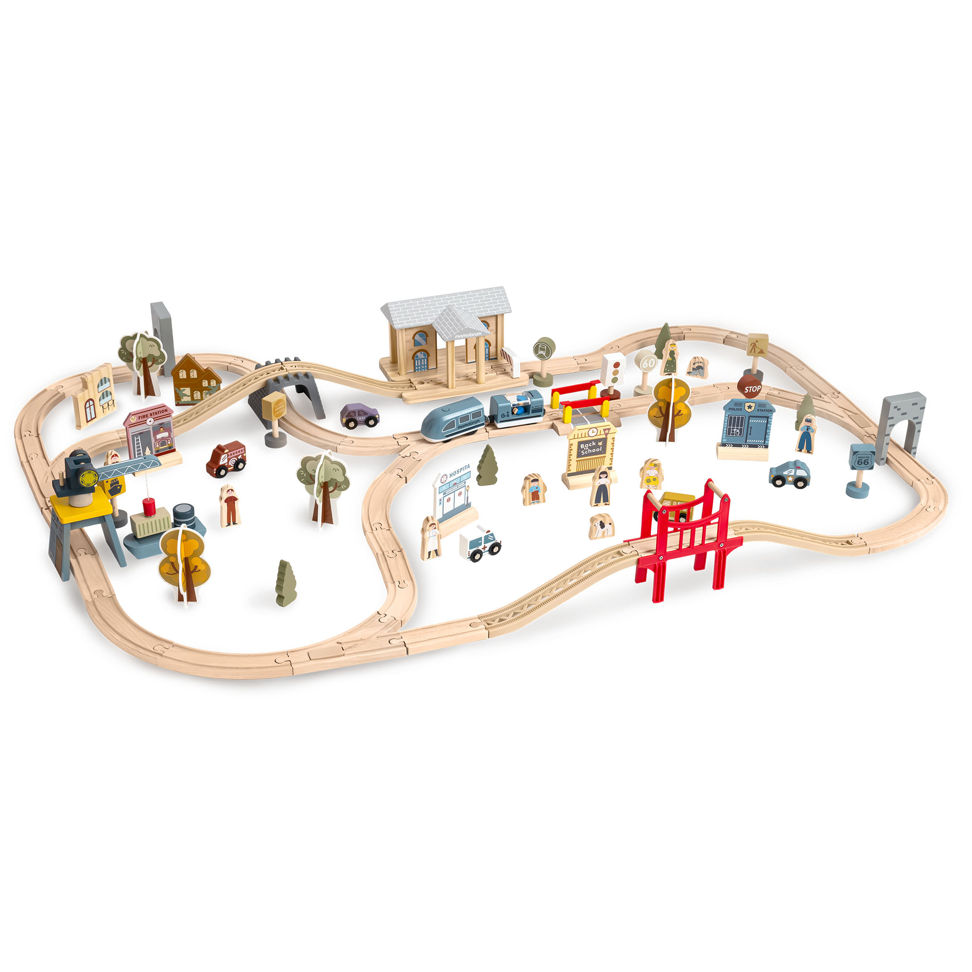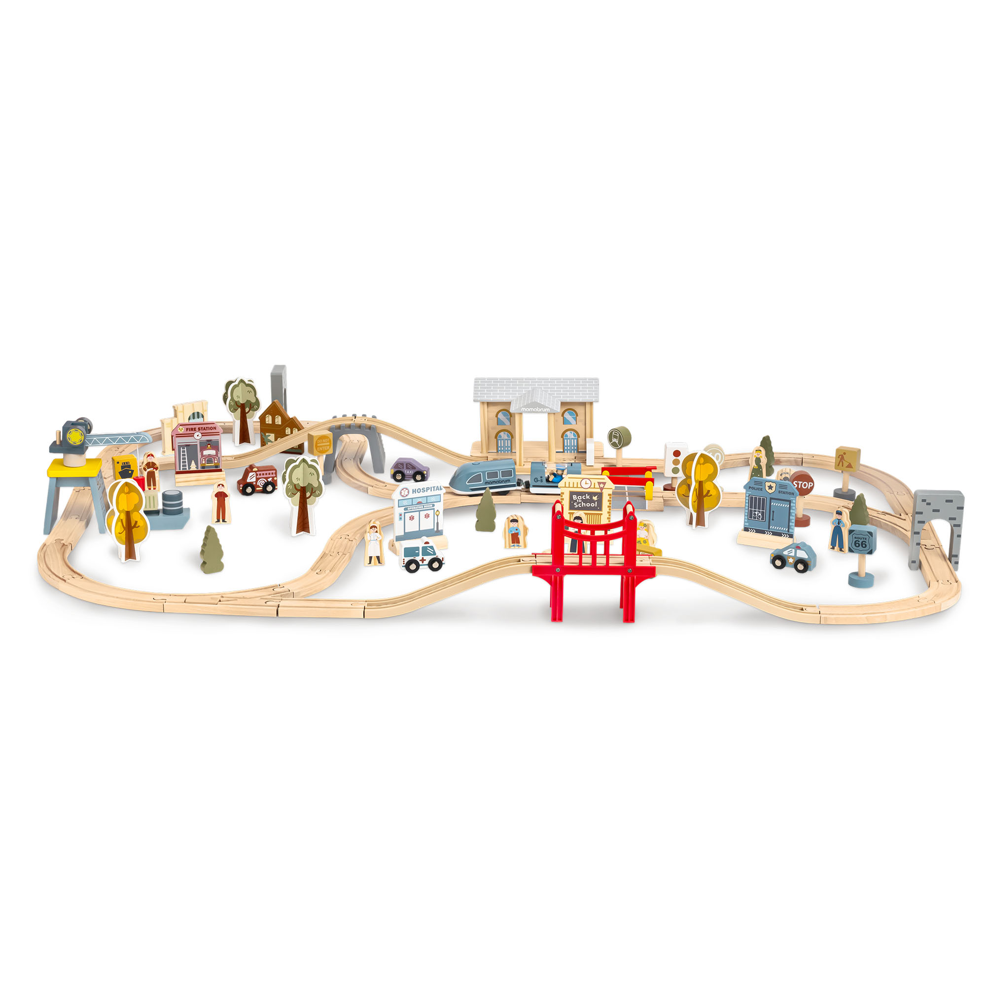 Nukelkite savo vaiką į šurmuliuojantį, nuotykių kupiną miestą! Šis medinis miesto traukinių rinkinys yra platus ir stebina savo detalių skaičiumi, gamybos kokybe ir išradingumu.