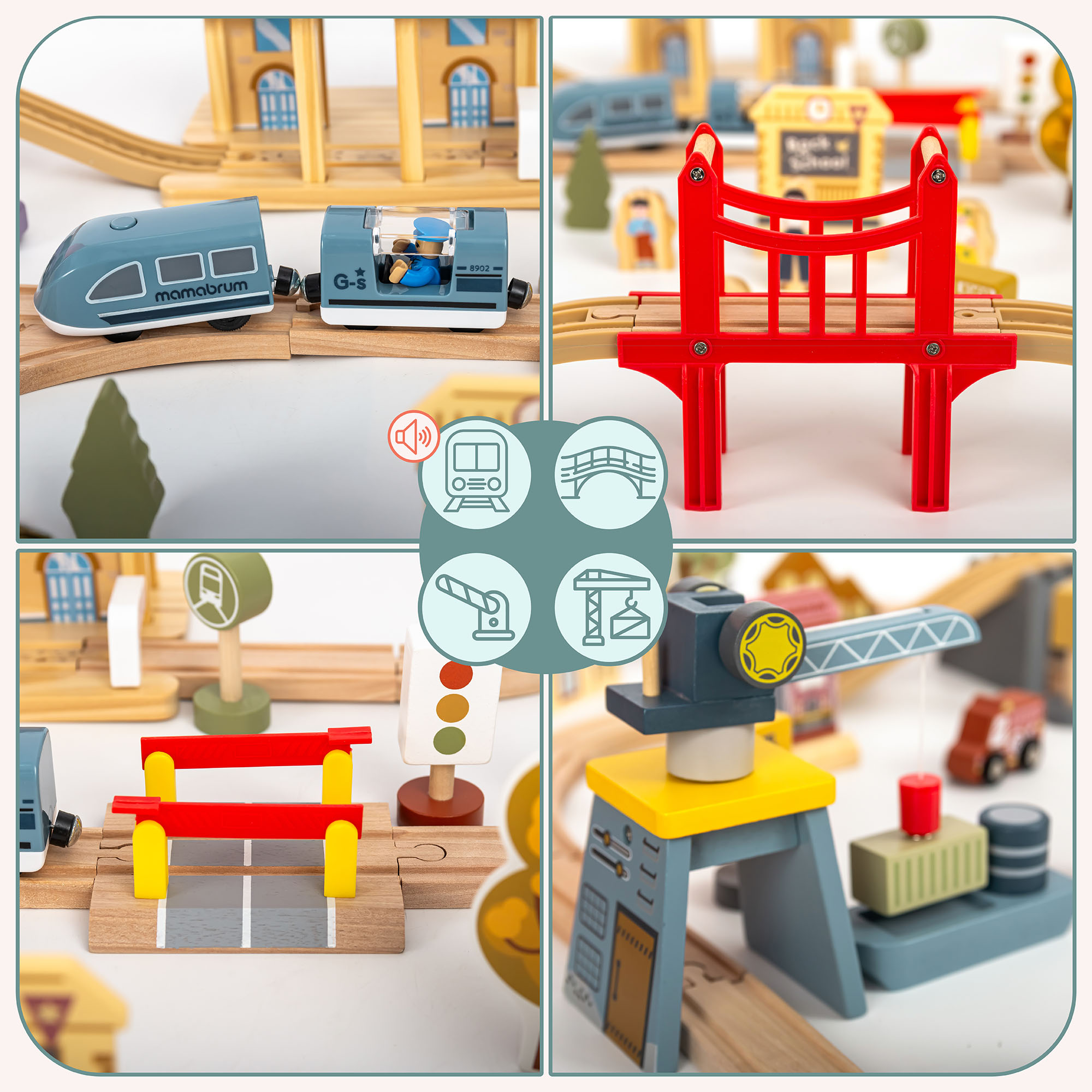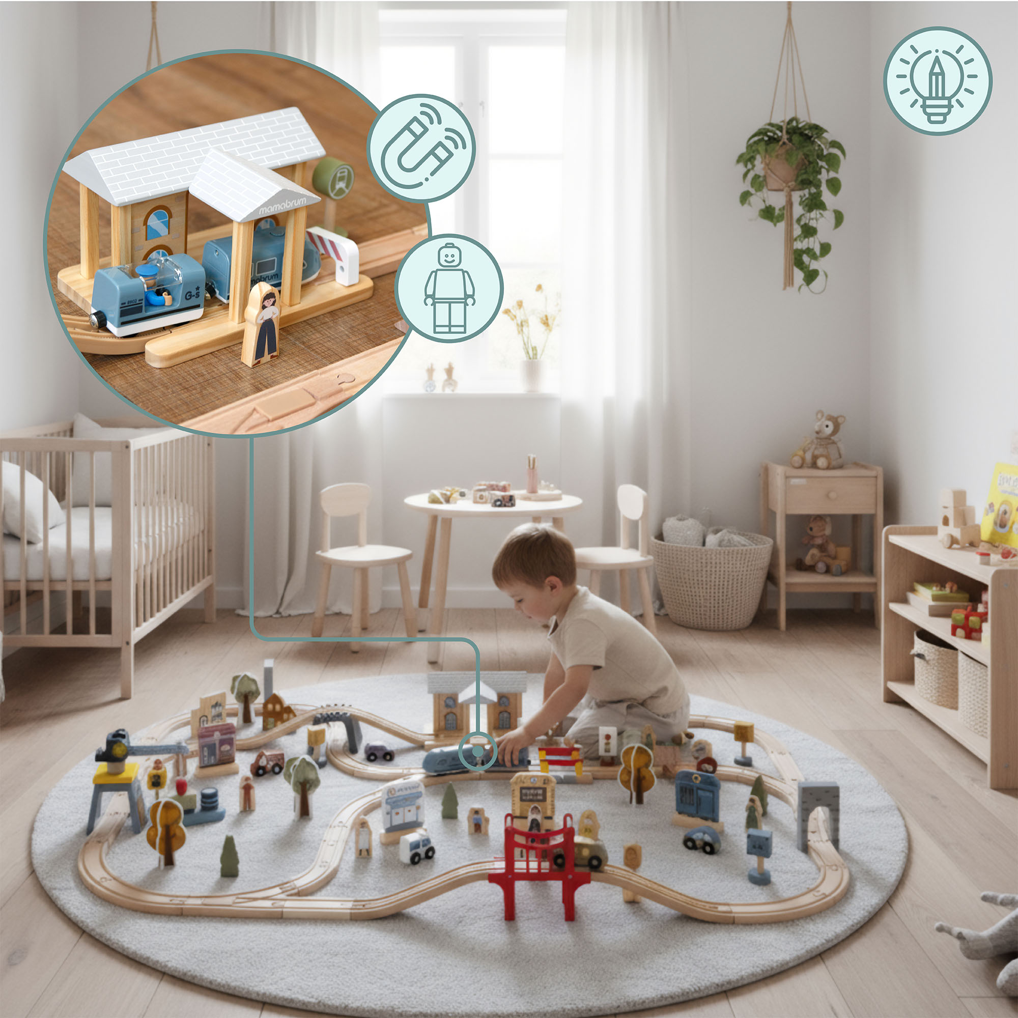 Tai ne tik bėgiai ir traukinys – tai visas miestas su tiltais, judančiu kranu, laivu, pastatais, automobiliais ir personažais, leidžiančiais vaikams kurti begalę istorijų. Elektrinis lokomotyvas su tikrovišku garsu pajuda per tiltą, pravažiuoja stotis ir sustoja mokykloje, ligoninėje ir gaisrinėje. Kiekviena kelionė – tai naujas nuotykis kūrybiško žaidimo pasaulyje!