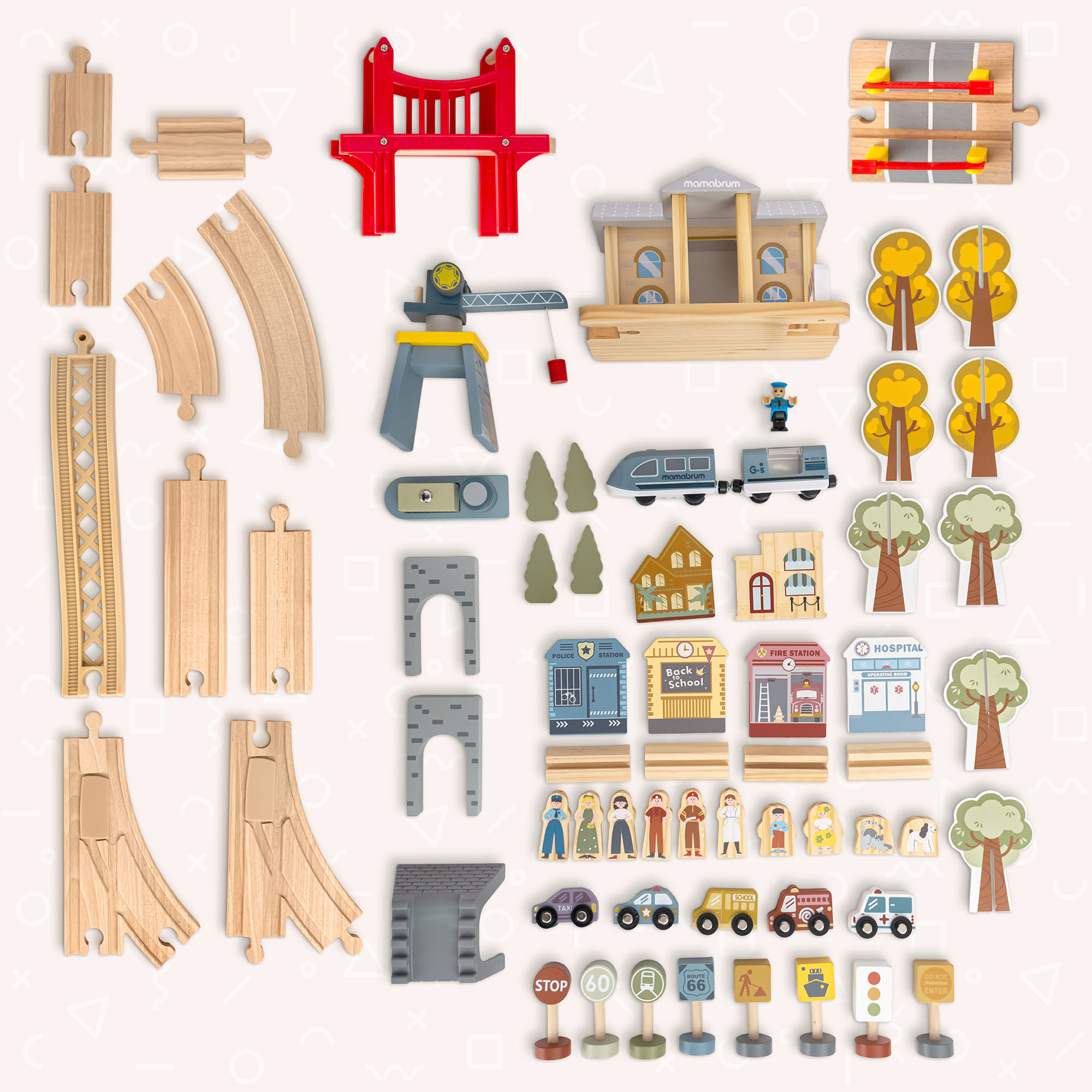 • Įtraukta daug elementų – pilnas miestas su bėgiais, transporto priemonėmis, figūrėlėmis ir daugybe priedų