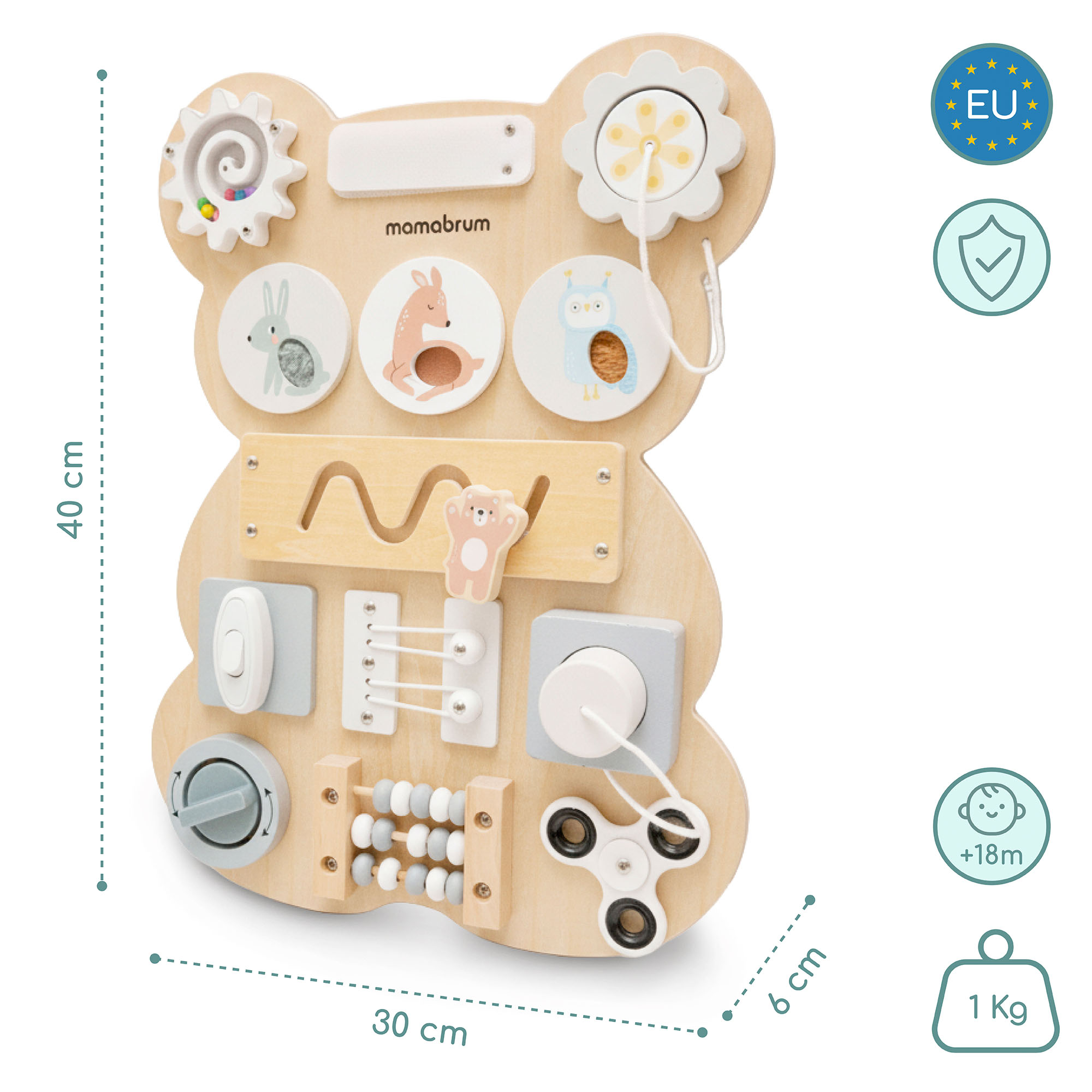 Ši medinė Montessori mokymosi lenta, kurios forma primena žavingą meškiuką, puikiai tinka vaikams, kurie mėgsta tyrinėti pasaulį per lytėjimą, judesį ir savarankiškus eksperimentus. Lenta apjungia žaislo ir edukacinės priemonės funkcijas , skatindama vaiko vystymąsi saugiu, natūraliu ir įtraukiamu būdu.