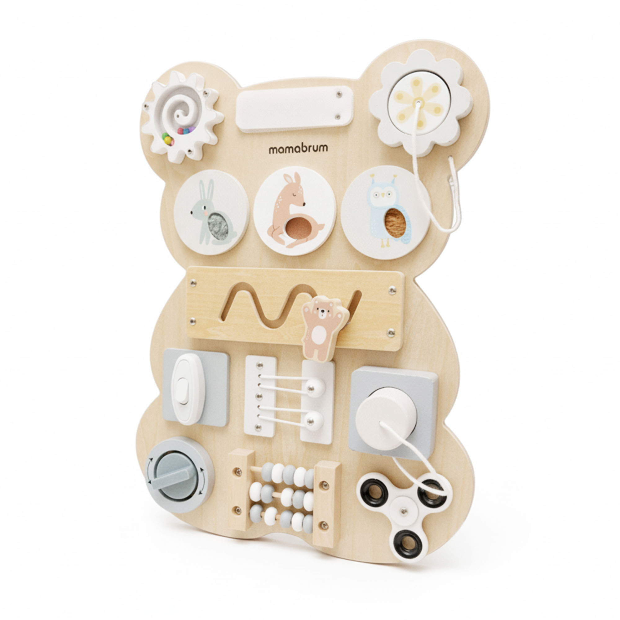 Medinė Montessori meškiuko manipuliacinė lenta - sensorinis savarankiškumo mokymasis: lipdukas, kaištis, labirintas, spragtelėjimo rankenėlė