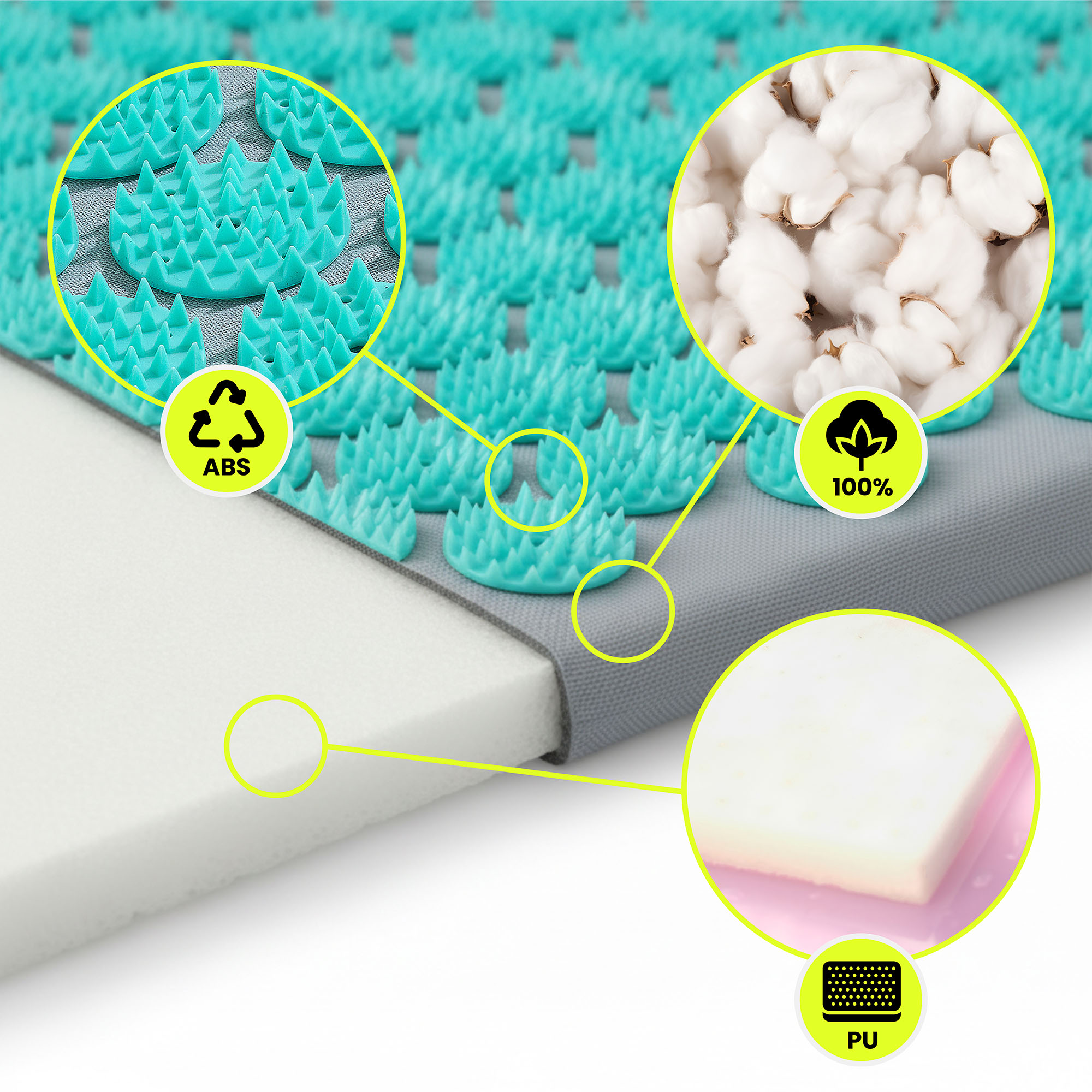 Kiekvienas rinkinio elementas sukurtas atsižvelgiant į patogumą ir kasdienį naudojimą. Kilimėlio ir pagalvėlių užvalkalai pagaminti iš natūralios 100 % medvilnės , kuri yra minkšta liesti ir maloniai liečiasi su oda, o vidus užpildytas lanksčiomis putomis, užtikrinančiomis stabilią atramą . Patvarūs plastikiniai spygliai turi saugiai užapvalintus galiukus , kurie suteikia švelnią, bet pastebimą stimuliaciją. Rinkinį užbaigia lengvas, atsparus dilimui nailono nešiojimo dėklas .