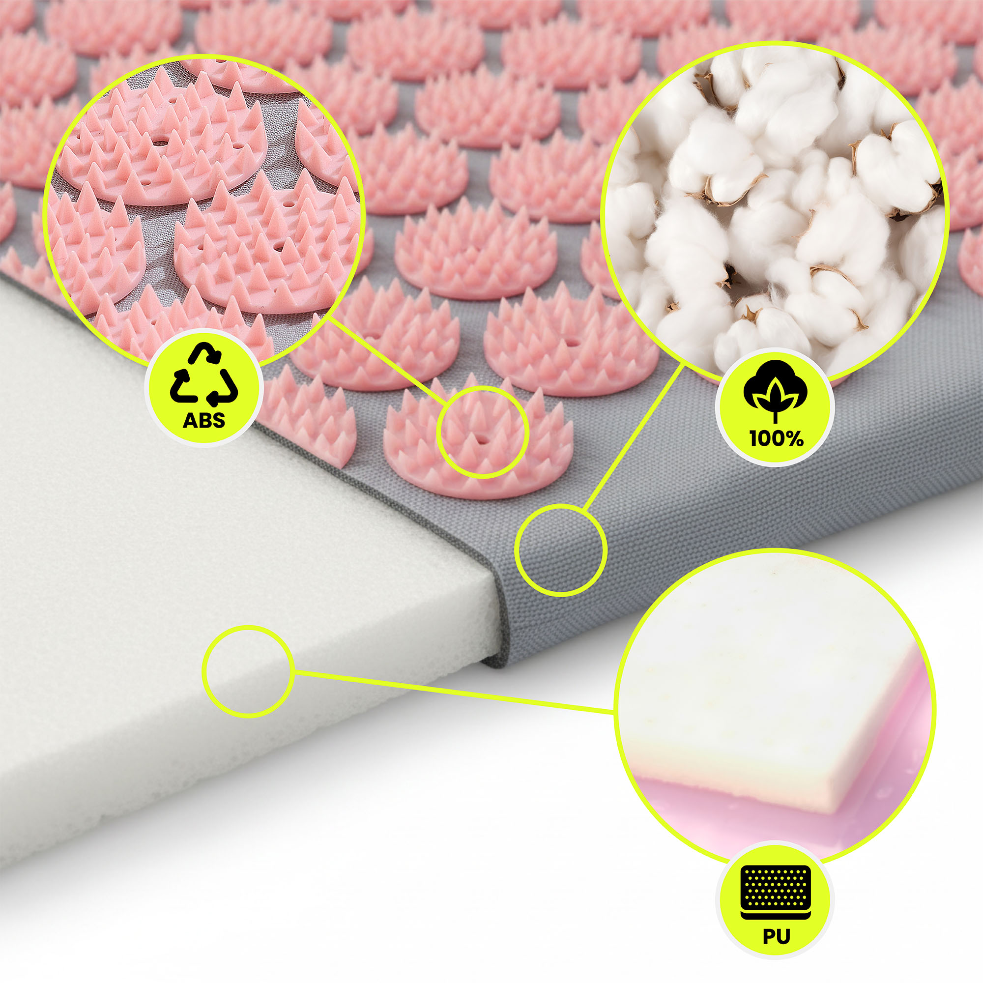 Kiekvienas rinkinio elementas sukurtas atsižvelgiant į patogumą ir kasdienį naudojimą. Kilimėlio ir pagalvėlių užvalkalai pagaminti iš natūralios 100 % medvilnės , kuri yra minkšta liesti ir maloniai liečiasi su oda, o vidus užpildytas lanksčiomis putomis, užtikrinančiomis stabilią atramą . Patvarūs plastikiniai spygliai turi saugiai užapvalintus galiukus , kurie suteikia švelnią, bet pastebimą stimuliaciją. Rinkinį užbaigia lengvas, atsparus dilimui nailono nešiojimo dėklas .