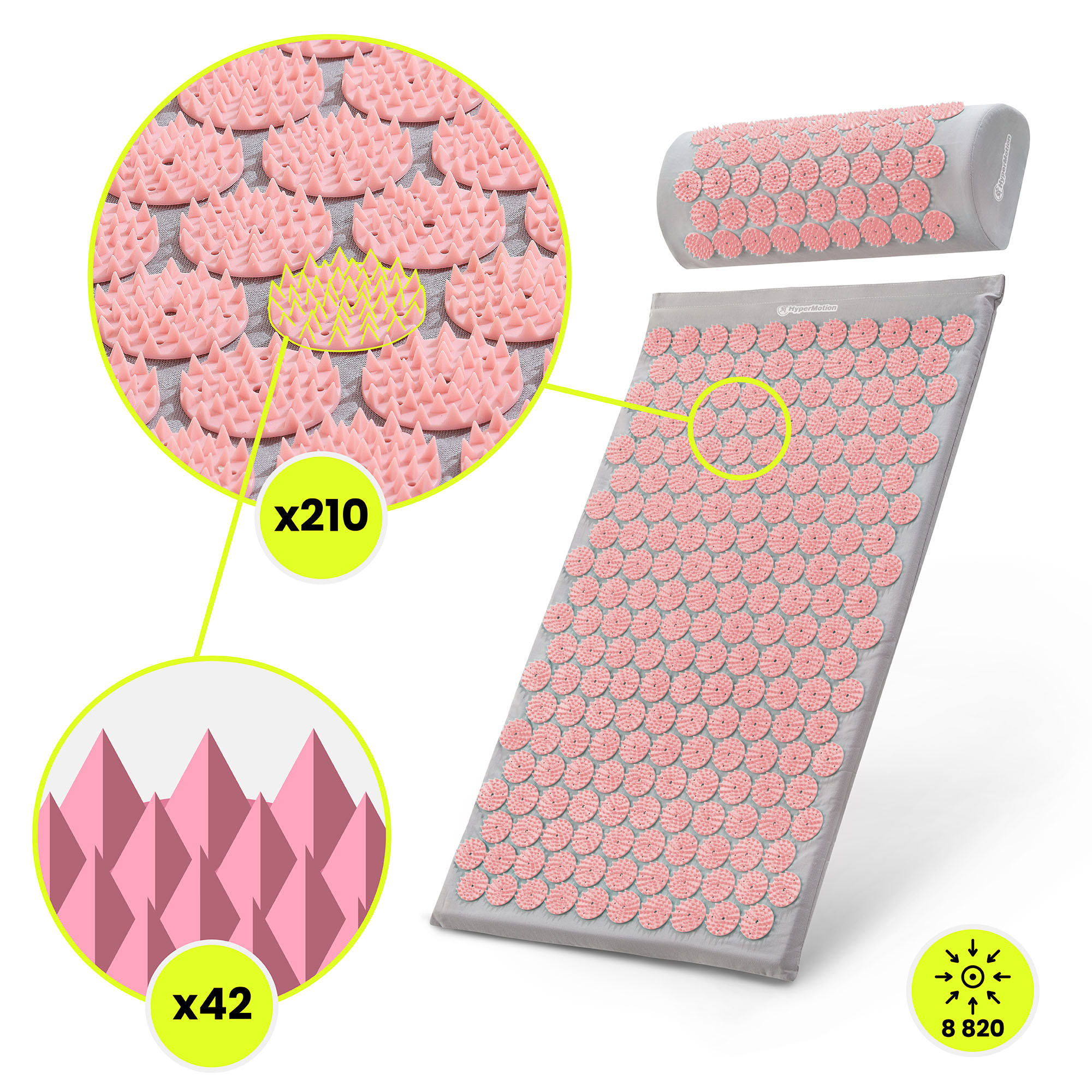 Akupresūros kilimėlis su pagalvėle ir užvalkalu – 72 cm „HyperMotion“ pilkas ir rožinis