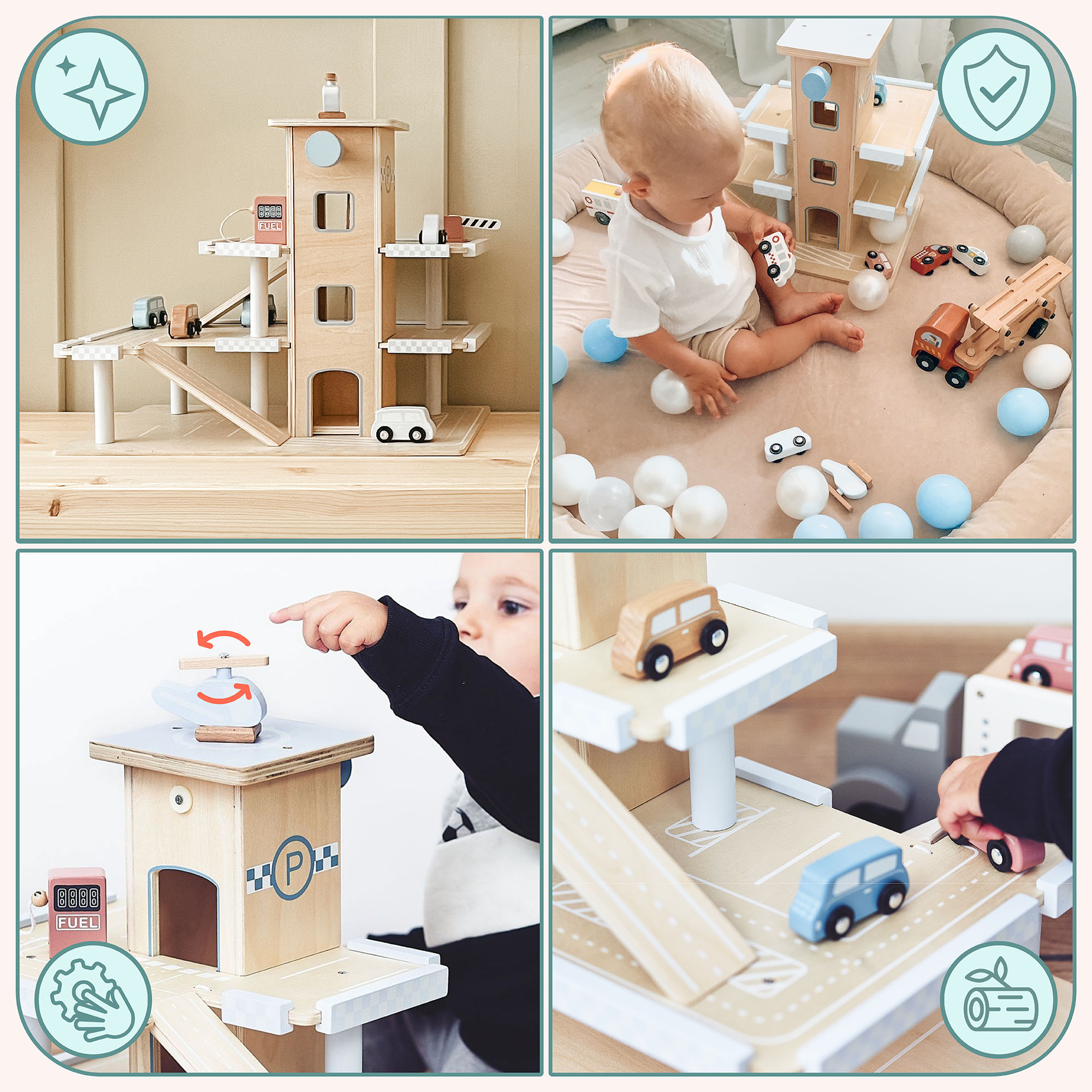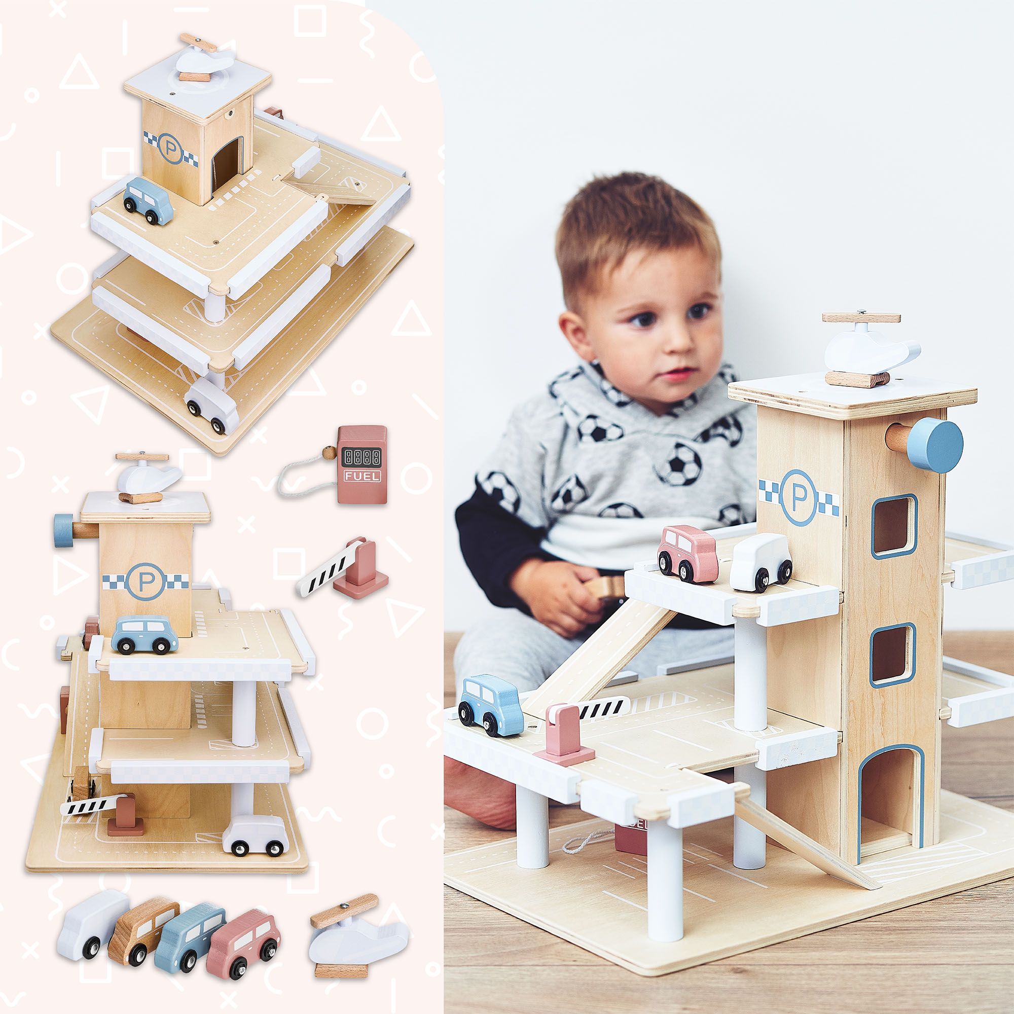 Garažas turi tris lygius ir nusileidimo kalnelį. Su mediniu žaislu vaikas gali žaisti kūrybiškai. Žaisdamas vaikas lavina akies ir rankos koordinaciją. Žaislas pagamintas iš aukštos kokybės medinės faneros, priedai nudažyti ekologiškais dažais.