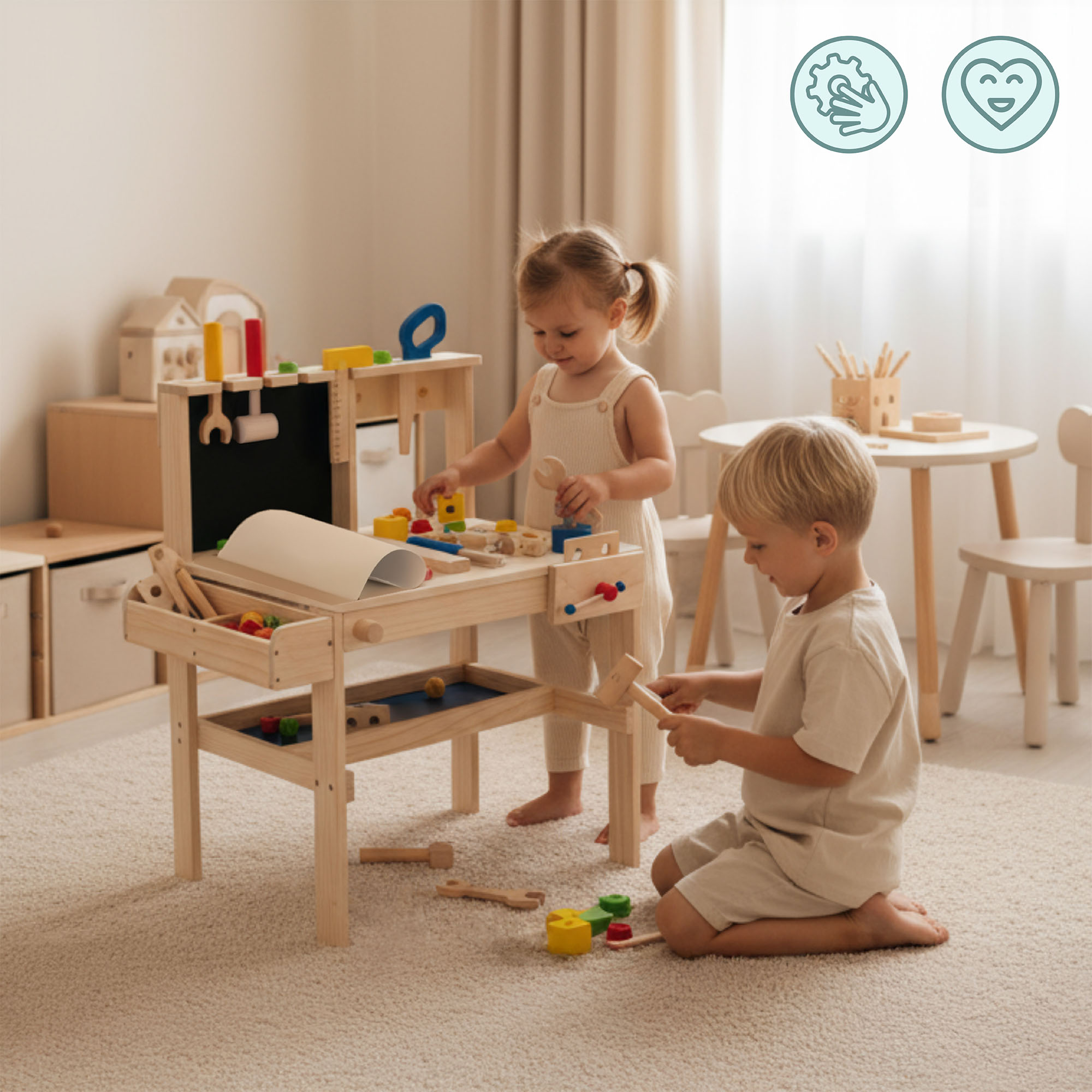 Gražus medinis "pasidaryk pats" rinkinys yra puikus žaislas, leidžiantis mažyliui lavinti rankų darbo įgūdžiussužinoti apie įrankius ir jų panaudojimą. Vaikams patinka tokie žaidimai!