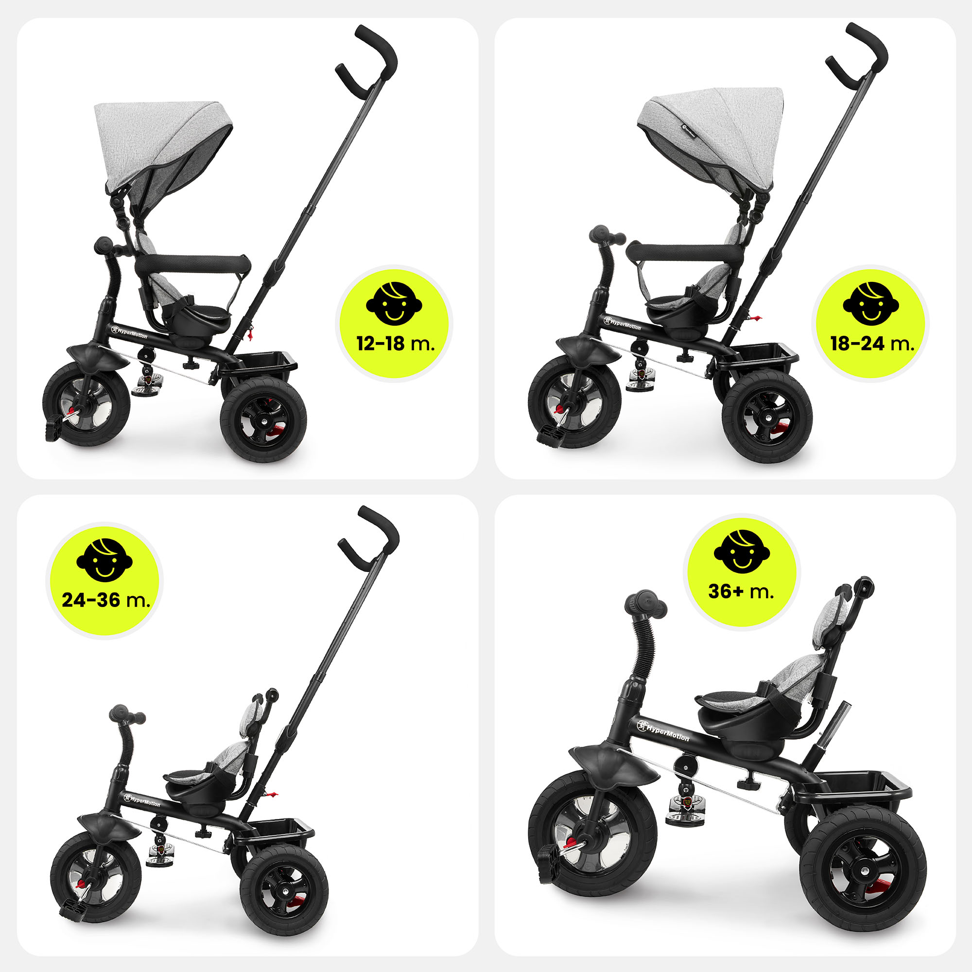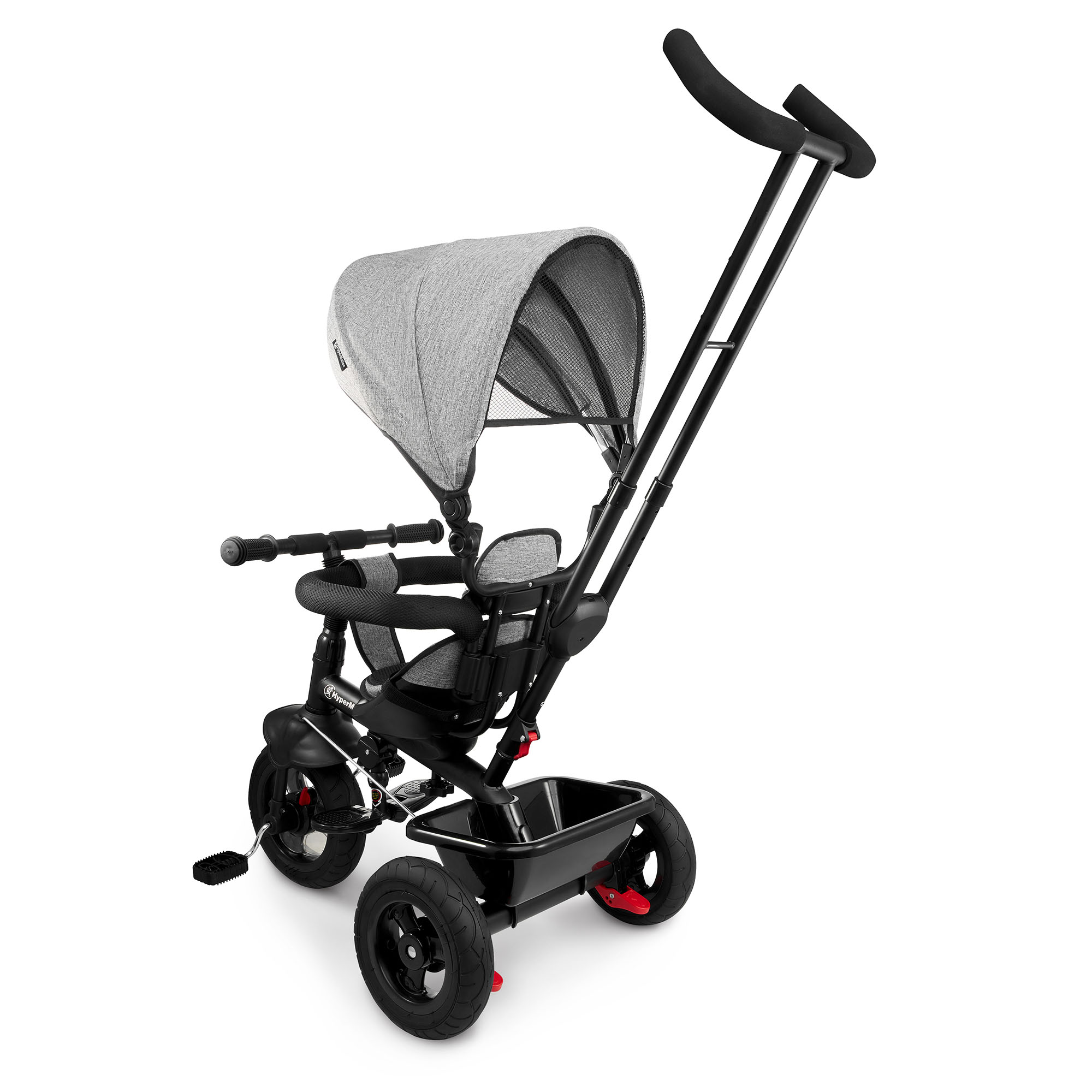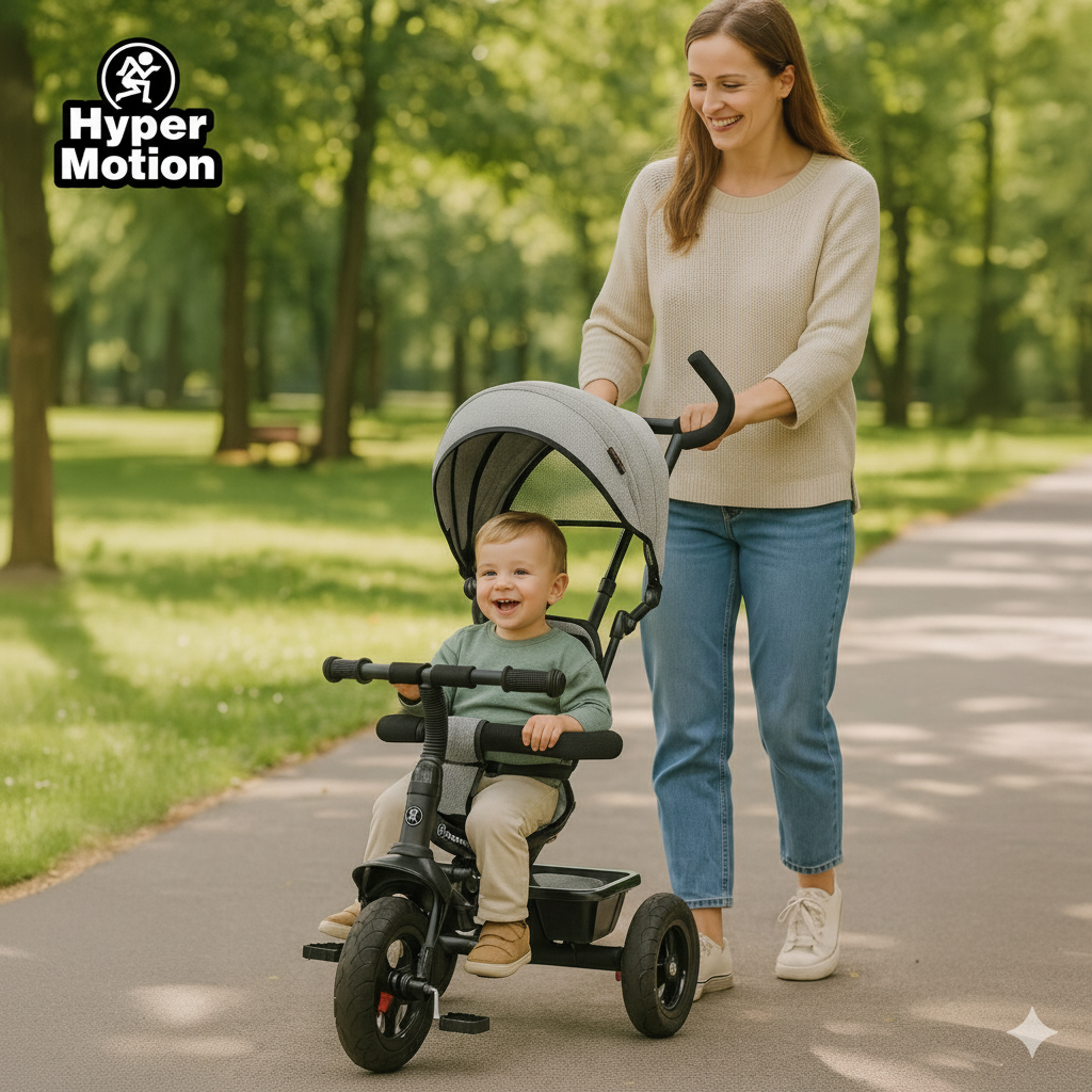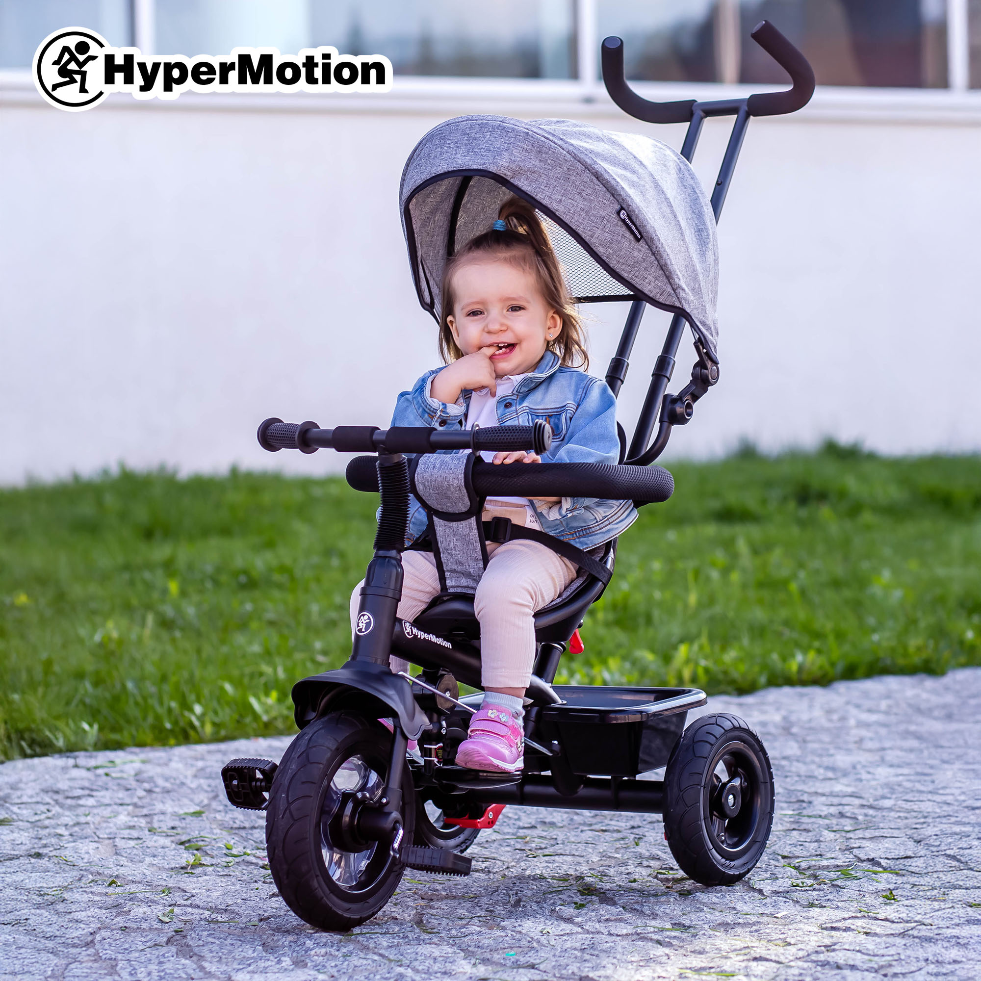 Triratukas 1-4 metų vaikams - TOBI FREY - pilka spalva - pasukamas - pompiniai ratai + stūmiklis